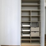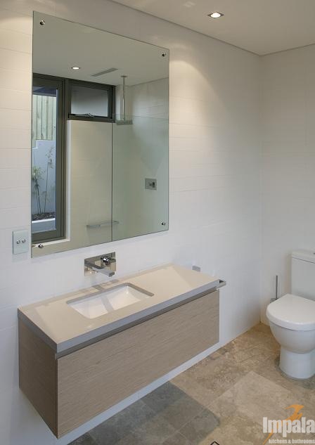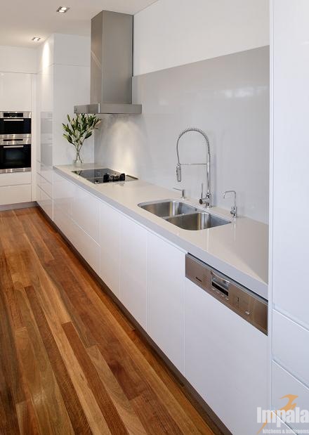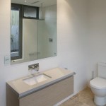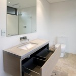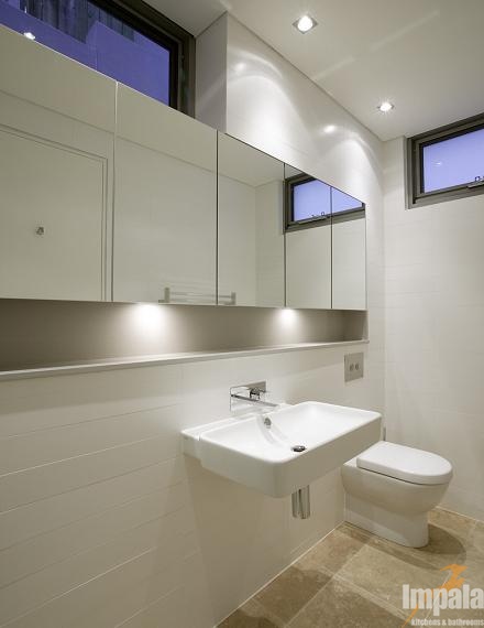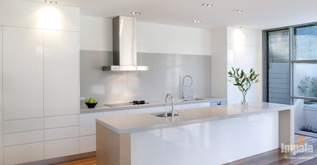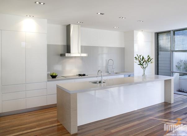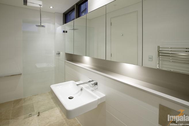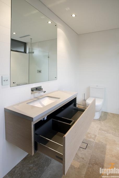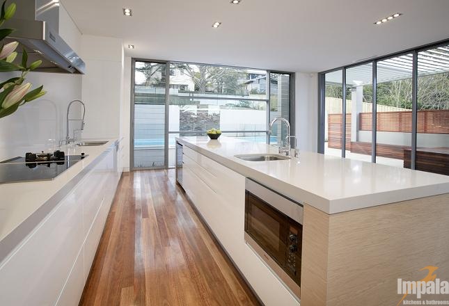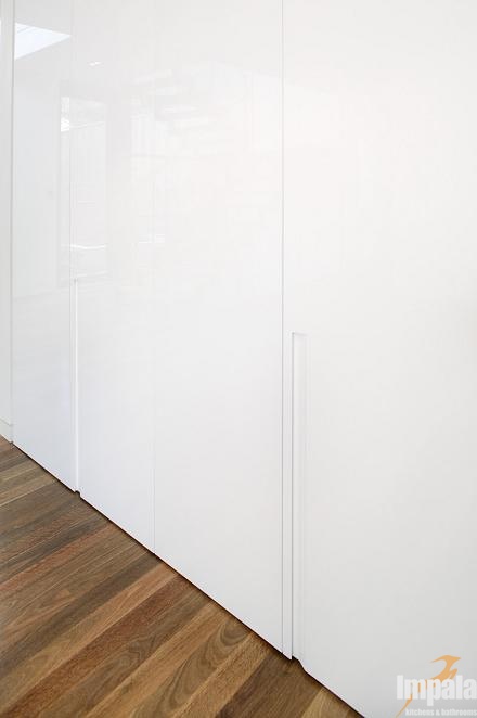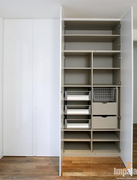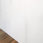 Our client was building an architecturally designed home on Sydney’s north shore. The home was to be contemporary and modern, but not something that would date. The client favoured neutral hues and natural tones. The kitchen was designed to be practical and minimum fuss, yet not boring. The substantial island unit has thick timber veneer panels at either end to balance the design and add texture. The splashback height is in proportion with the room space and adds interest just as the thick bench top balances the kitchen size. Wardrobes were kept simple to blend into the wall space, inserts were cut down the side of the doors eliminating the need to fix handles and to maintain the seamless look.