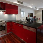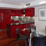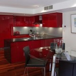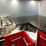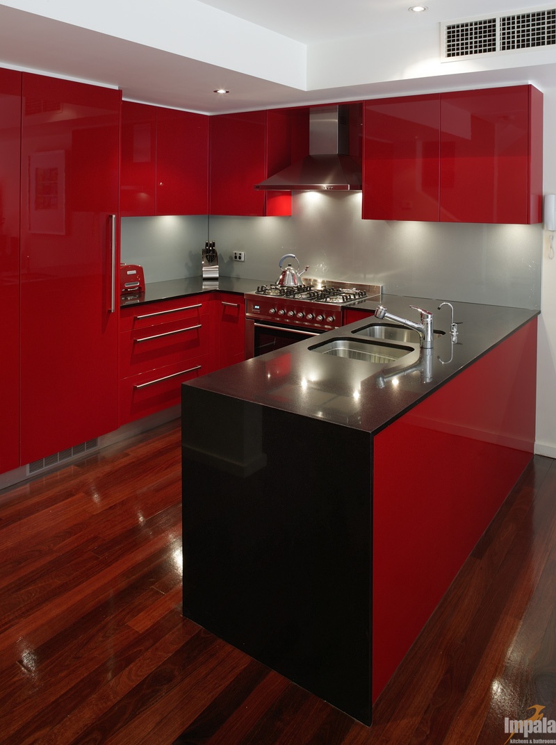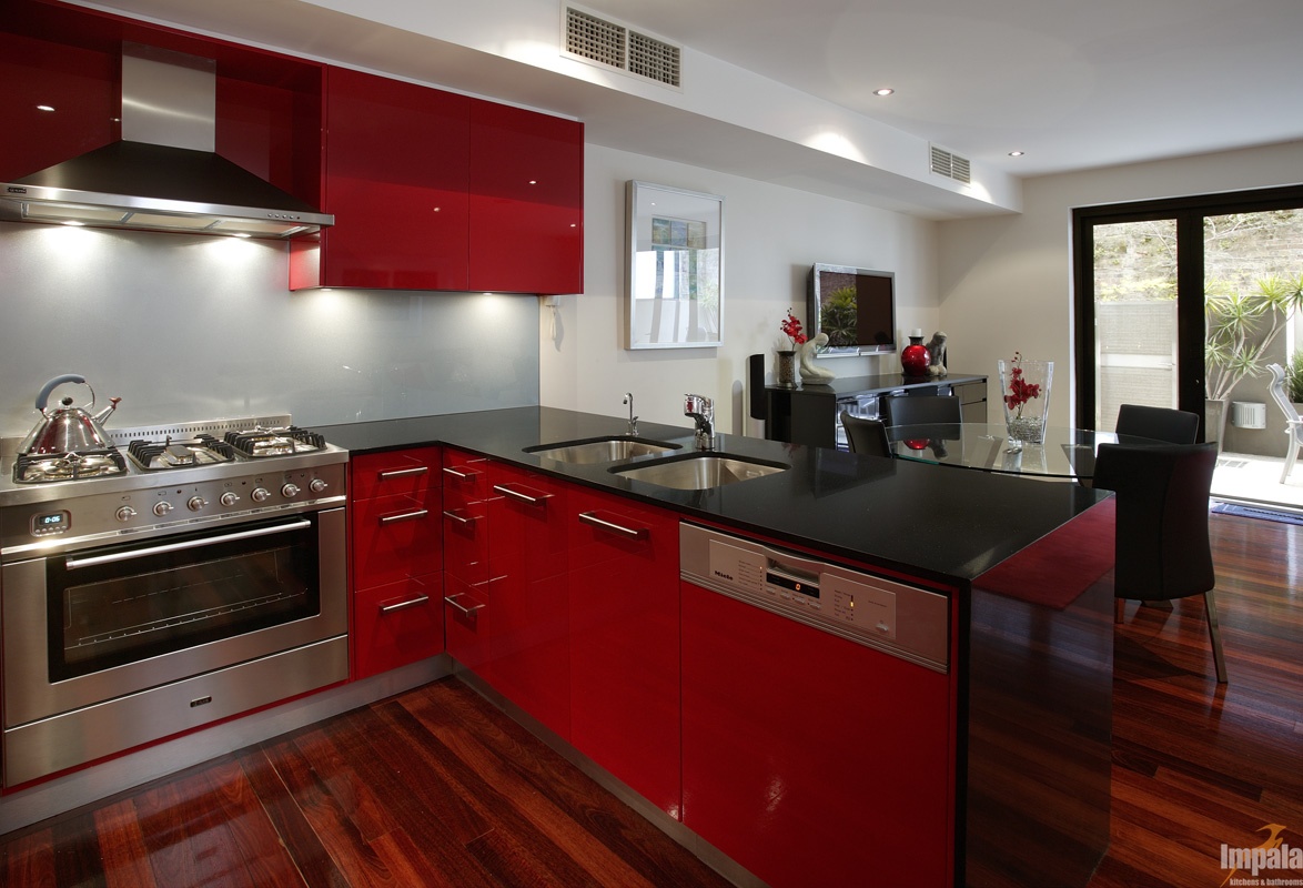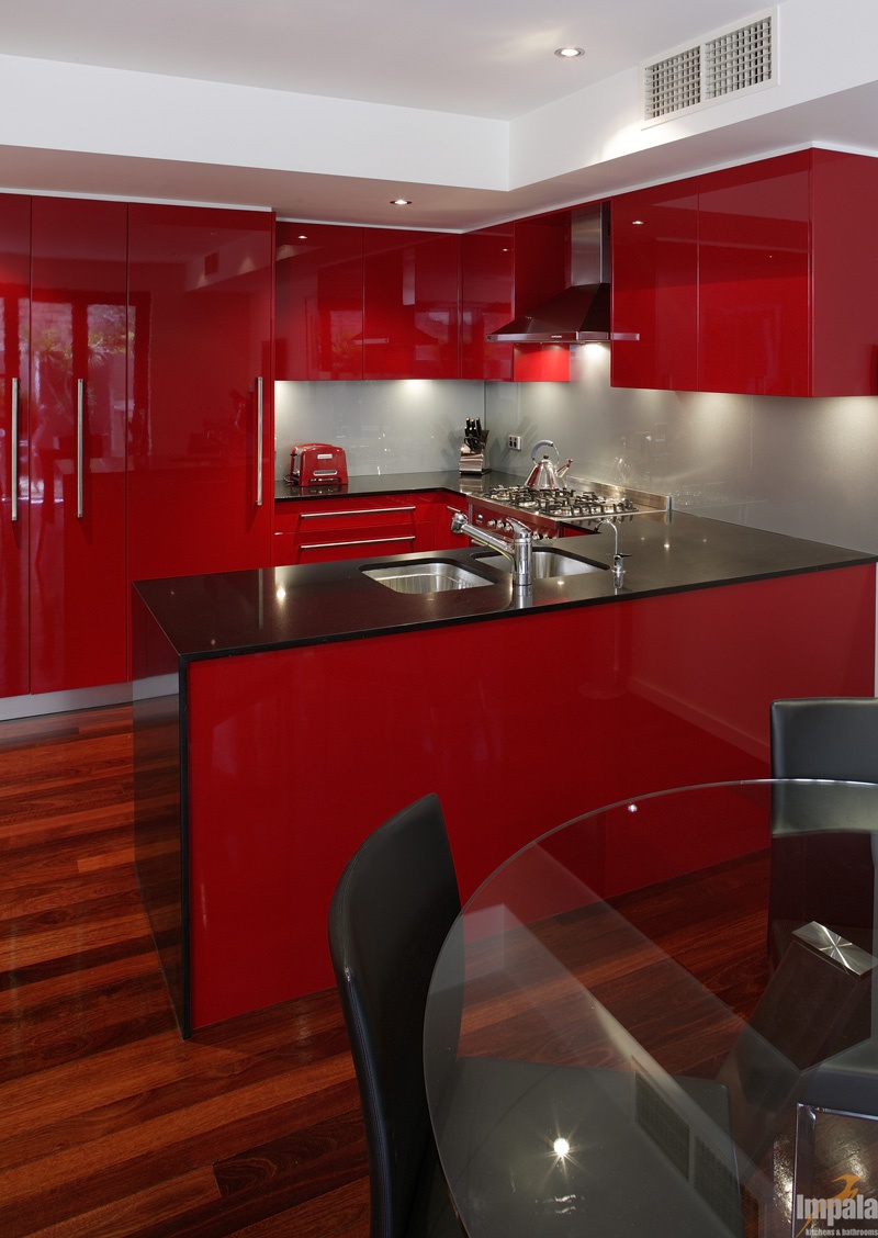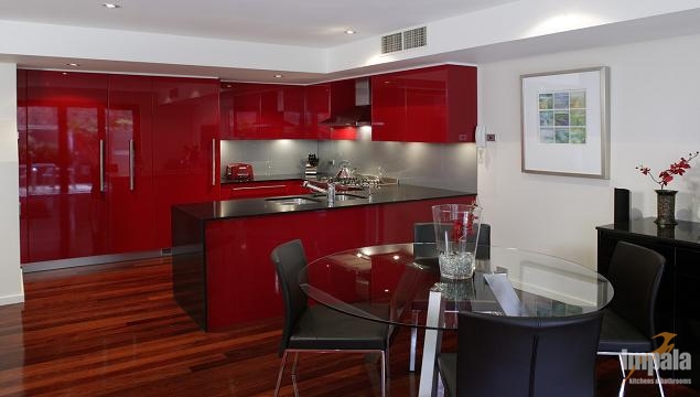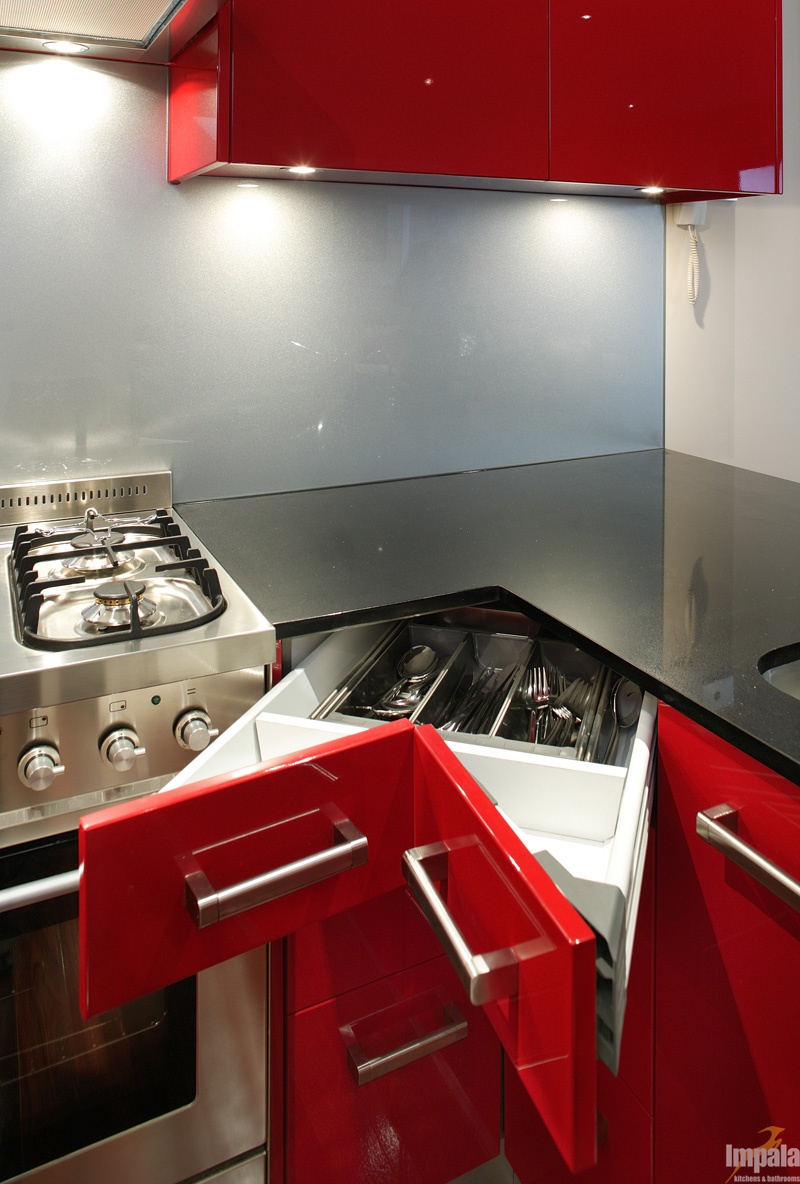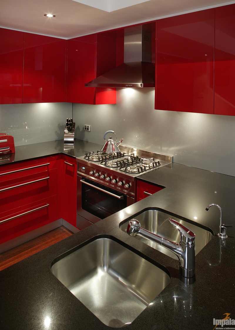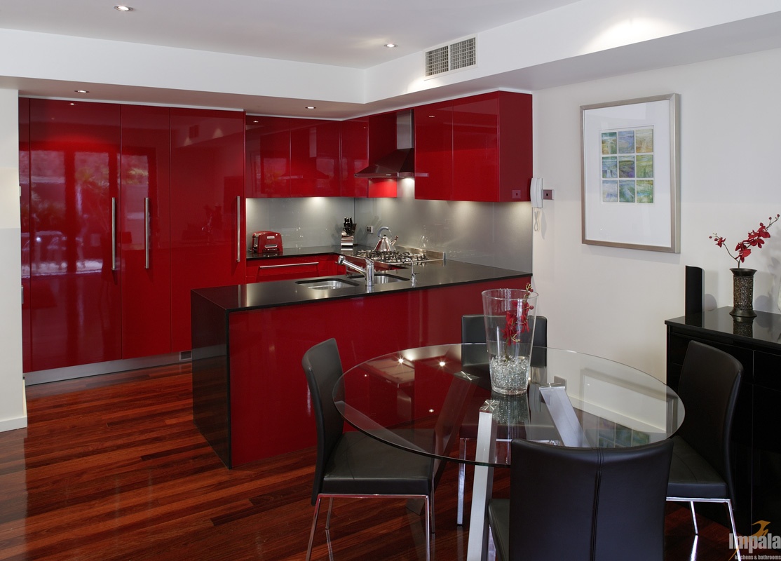 The client brief was for a modern design, using a bold funky colour and definitely the “WOW” factor. The old kitchen was an antique white colour and in the client’s opinion very boring. The kitchen space was to be the focal point in the living area and to allow for entertaining whilst also servicing the two occupants living there. With this in mind, Impala designed a bold capsicum red kitchen with high gloss polyurethane doors and a striking contrasting black stone bench top. The splashback is a metallic-painted glass, which complements the stainless steel appliances.
