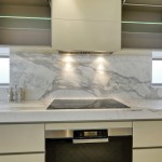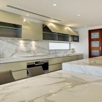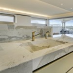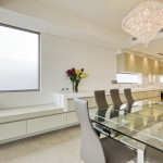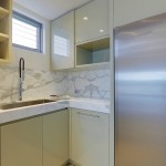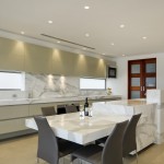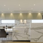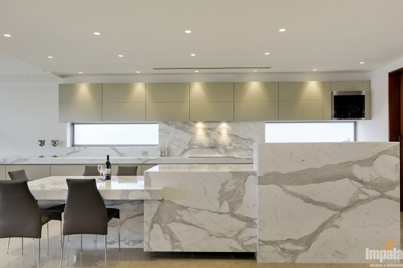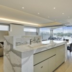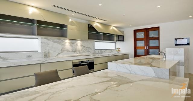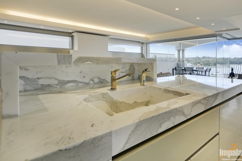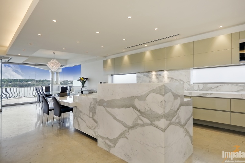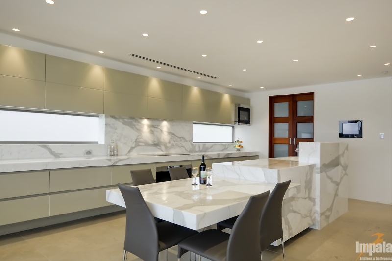 The kitchen makes extensive use of Calcutta marble and custom colour gloss polyurethane joinery. Practical overhead cabinets with a lift up mechanism, glass shelves and LED lighting were installed. To add interest and dimension to the large island, three different stone heights were designed. The kitchen sink was crafted out of the marble top. A large scullery is located behind custom timber doors, where a second sink and substantial fridge is kept. This area serves as a food preparation zone and large pantry area. Electronic drawers run the entire length of the kitchen.