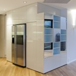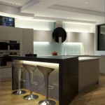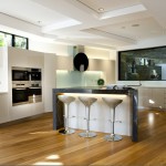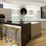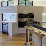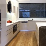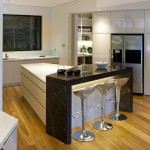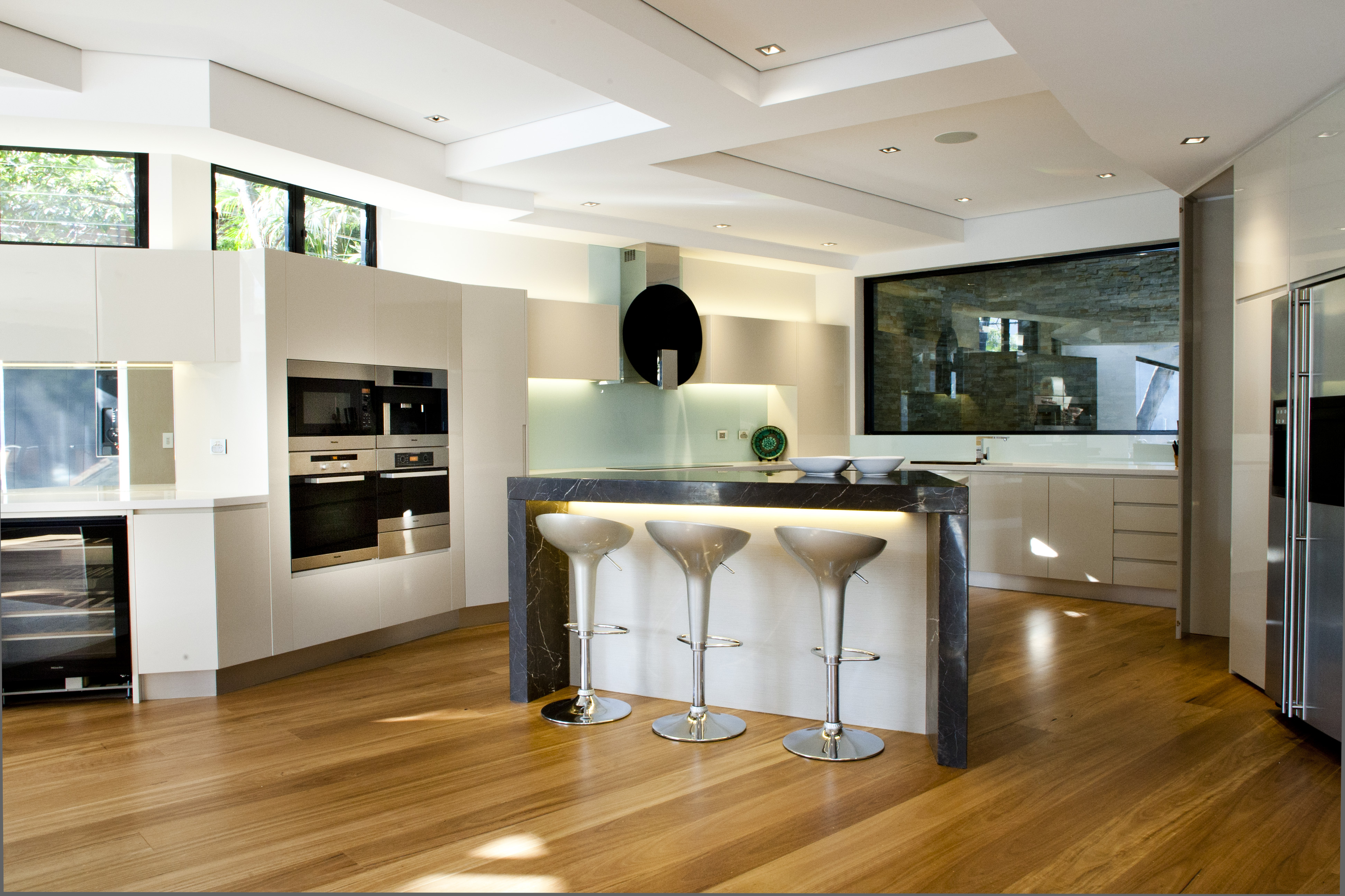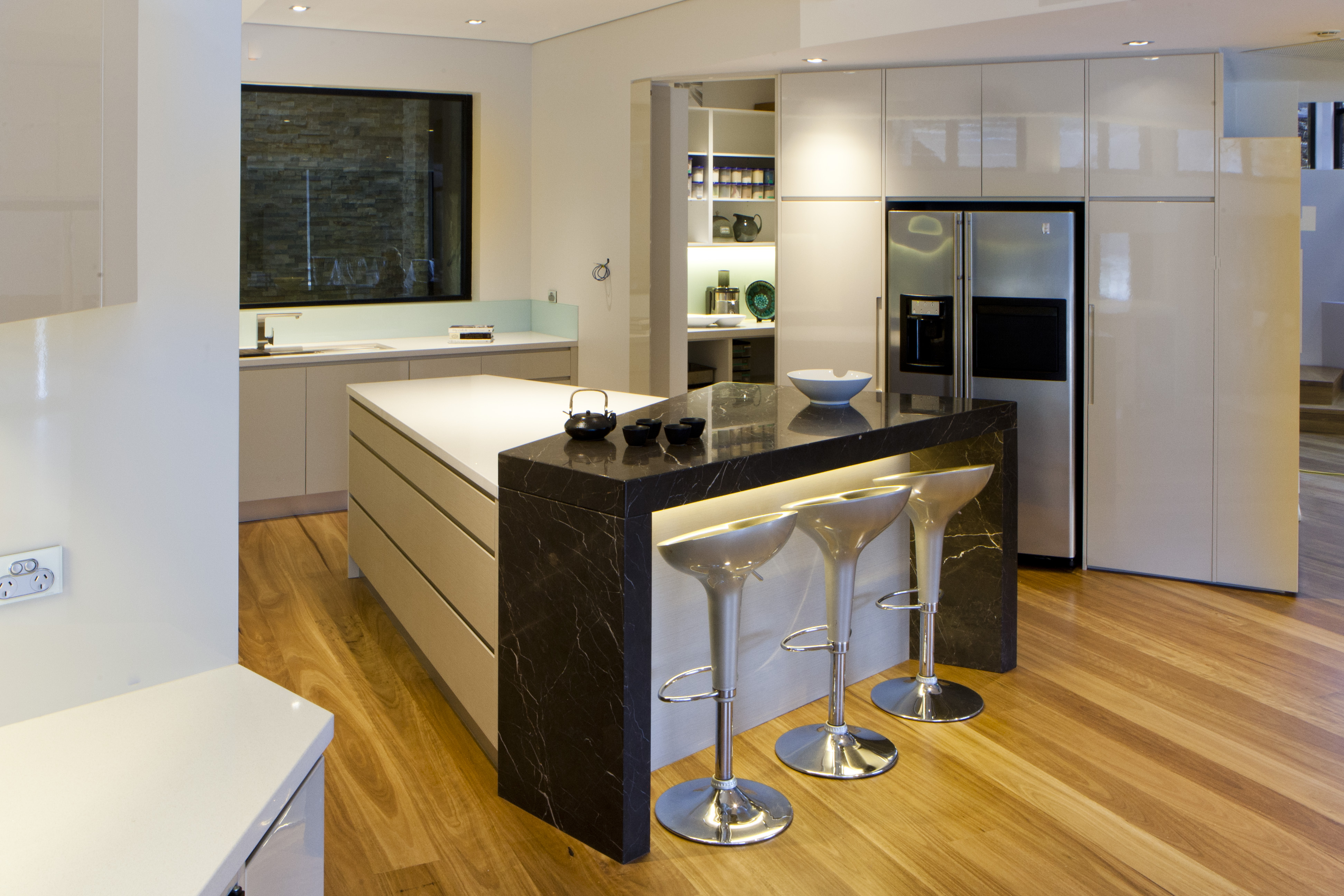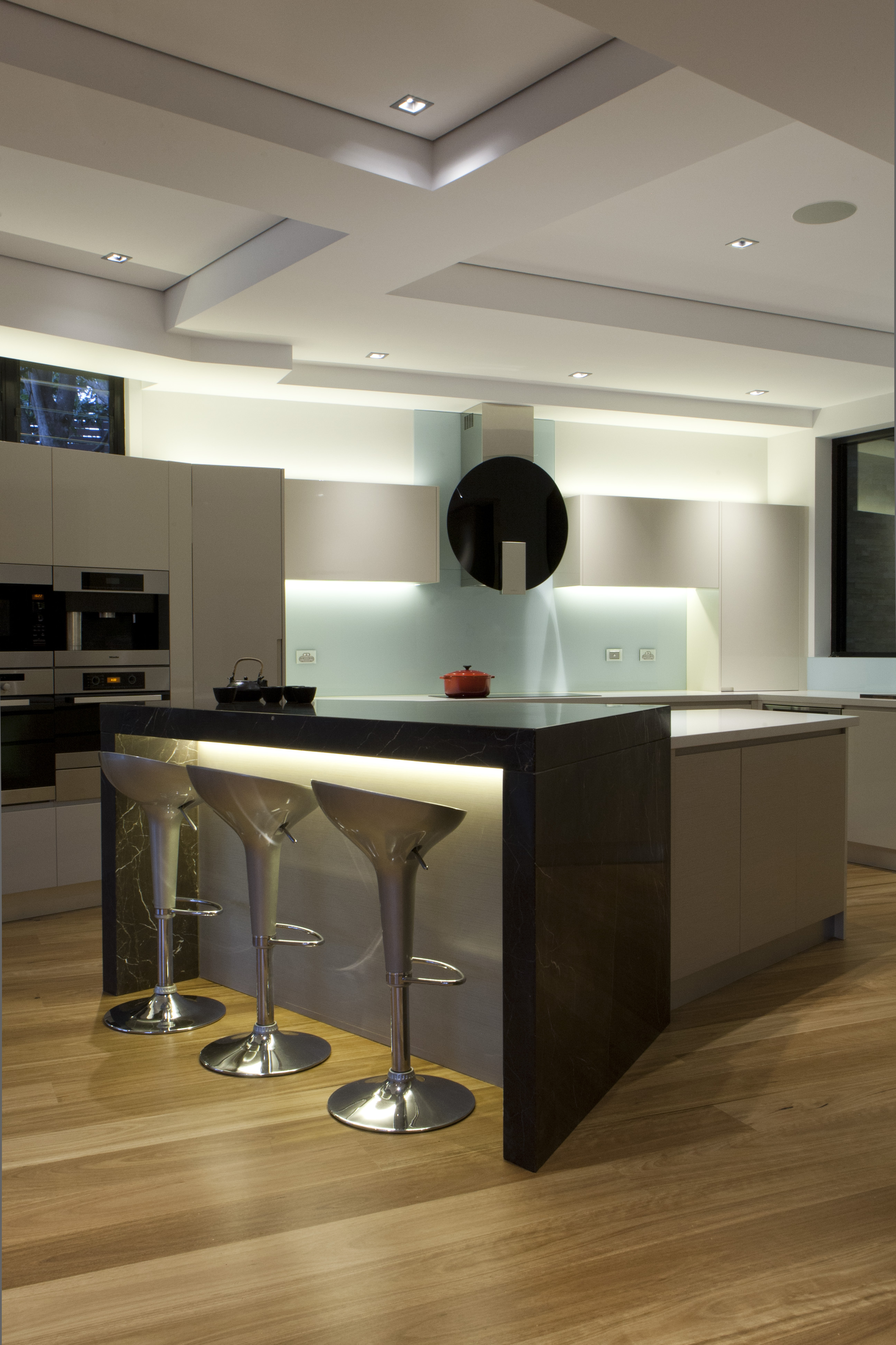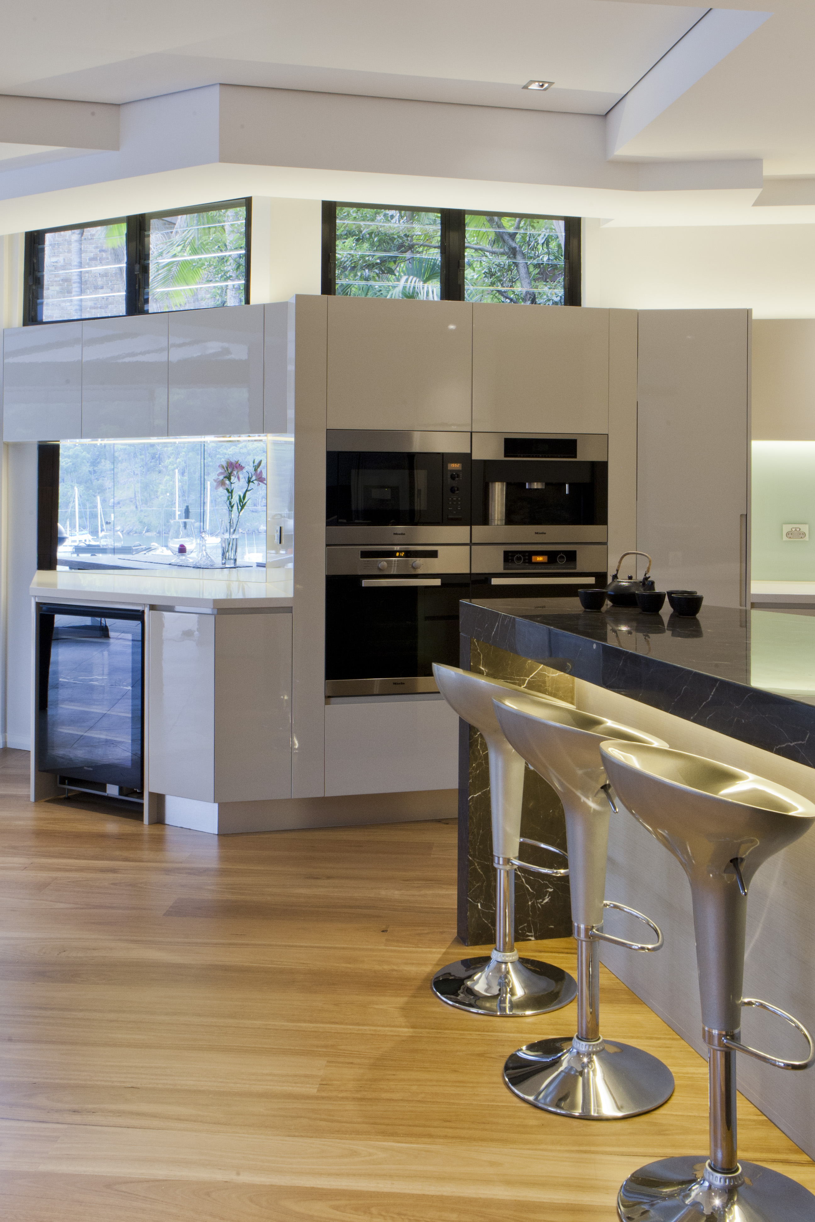 “This waterside home required an impressive yet casual kitchen to suit the owners’ relaxed lifestyle and the architectural design of the home. A contemporary look was achieved using bold geometric forms that echo the shape of the space. The two intersecting trapezoids forming the island are a striking focal point while providing generous bench space within easy reach of the refrigerator. With a nod to the shape of the sailing boats outside, the angled island visually balances the space and creates a smooth flow to the main work area. A mirrored display unit and drinks cabinet with mirrored splashback reflect the waterfront view throughout the space.