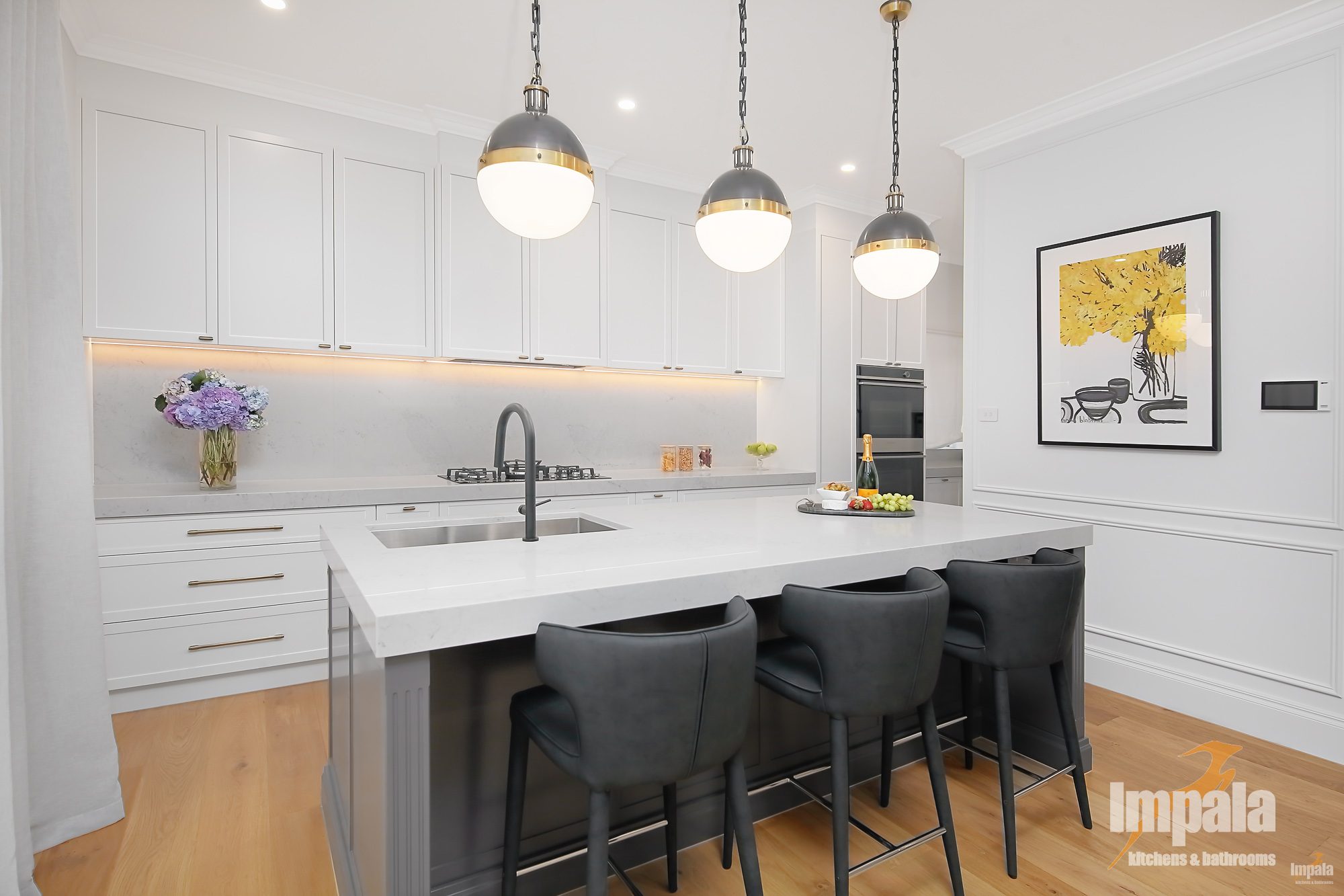 This kitchen isn’t just about looks. Functionality was extremely important to this busy young family of five. With a large open butler’s pantry just off the kitchen where you can tuck your appliances out of sight but ensure daily used items can be easily accessed. The kitchen comes with all that you need for budding chef, with a Zip Tap, wine fridge, double ovens (one steam), large gas cook top plus loads of storage space and walk-in pantry. A bar was also create using the same colour and tones from the kitchen bringing cohesion and connecting the kitchen and the dining area.