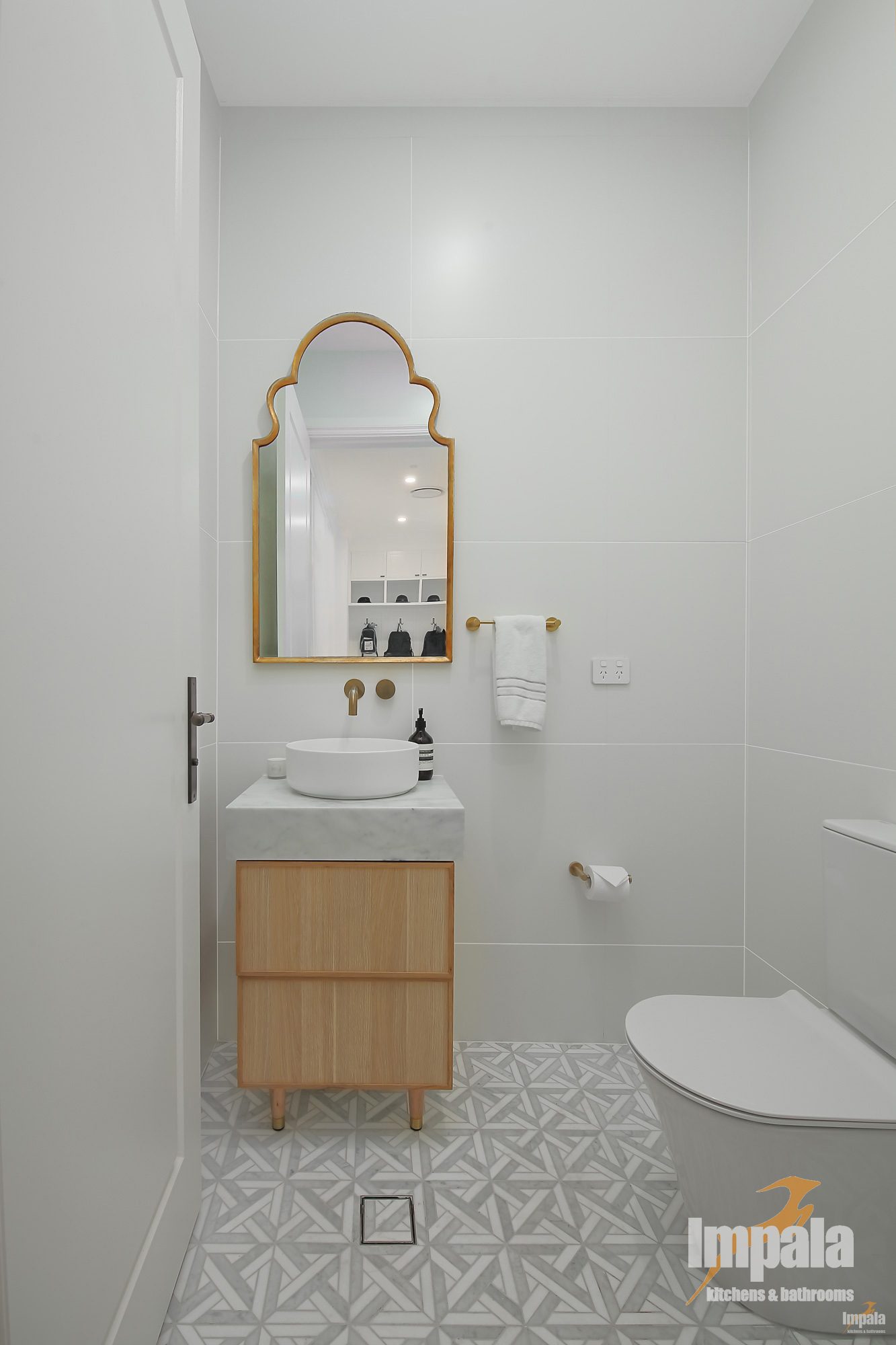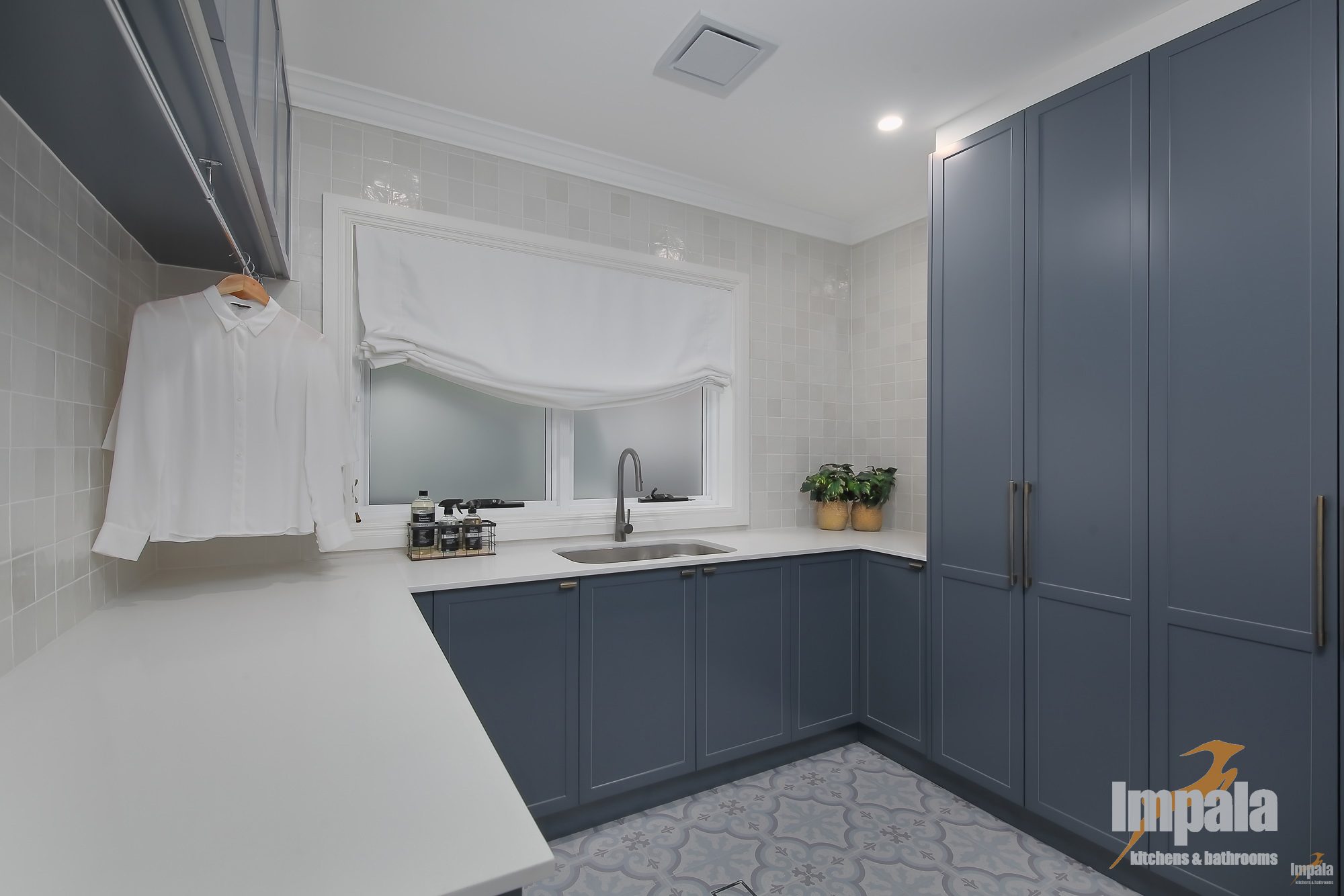 Extensive joinery was used in the laundry, ensure the space was fully utilized and offering additional storage space. Once again, the joinery theme was repeated with shaker doors and similar hardware from the kitchen space. A gorgeous, patterned floor tile was used, giving a nod to this home’s heritage.