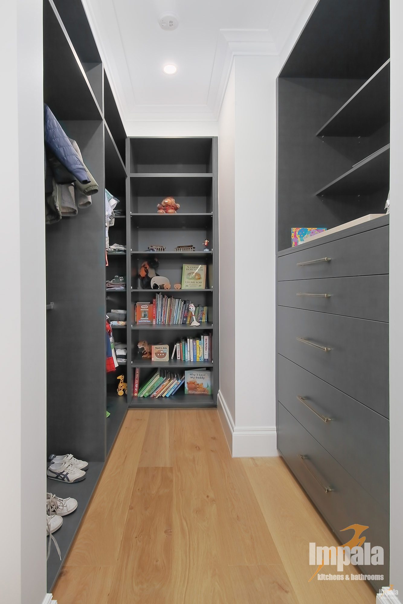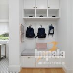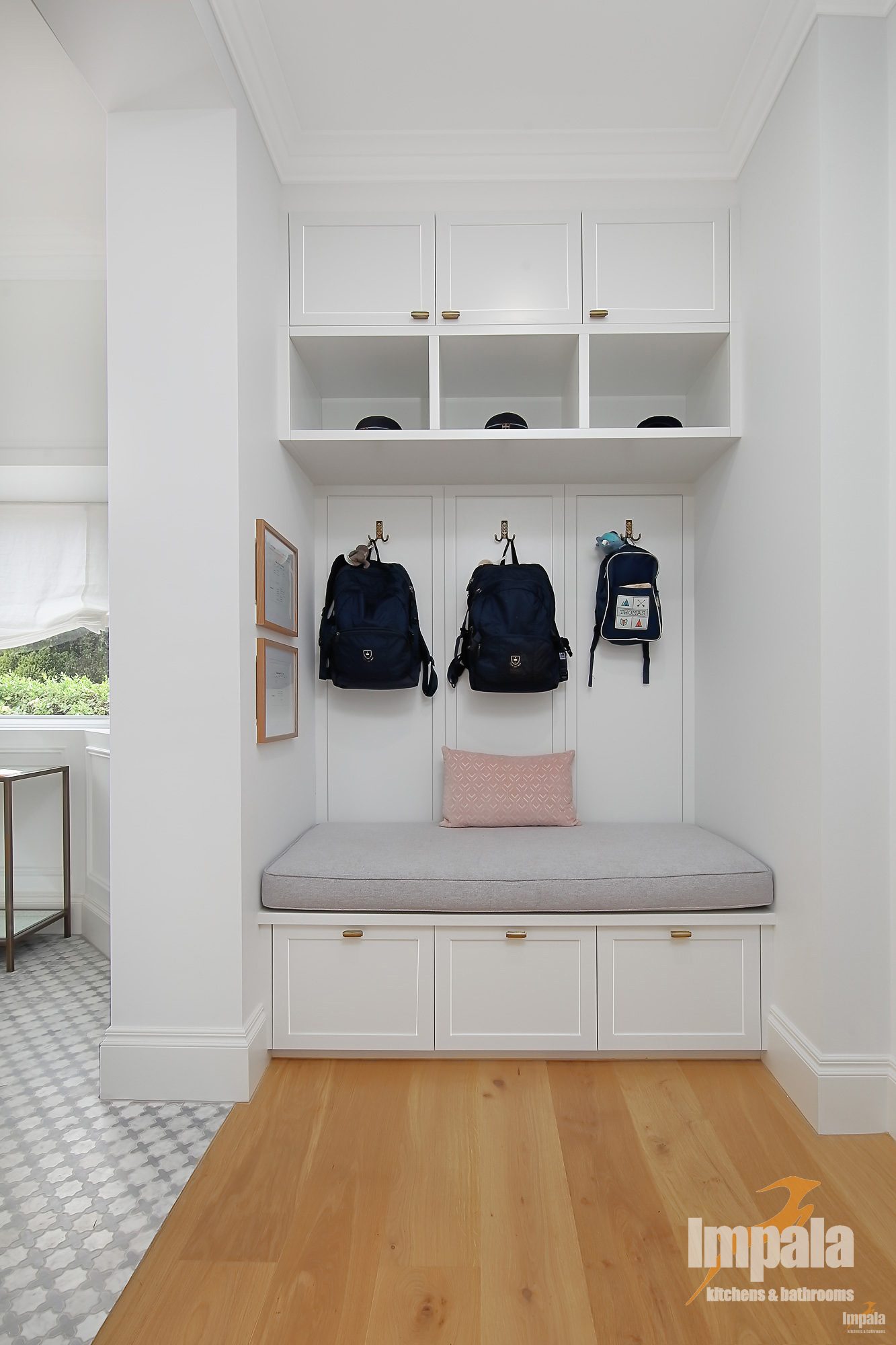 Upon entry you are greeted by a propose designed and built entryway storage. With cubbies for three school bags and hats. A beautiful, upholstered bench seat with under seat draws for shoes. It’s a wonderful example of how you can make a practical space look stylish and neat.