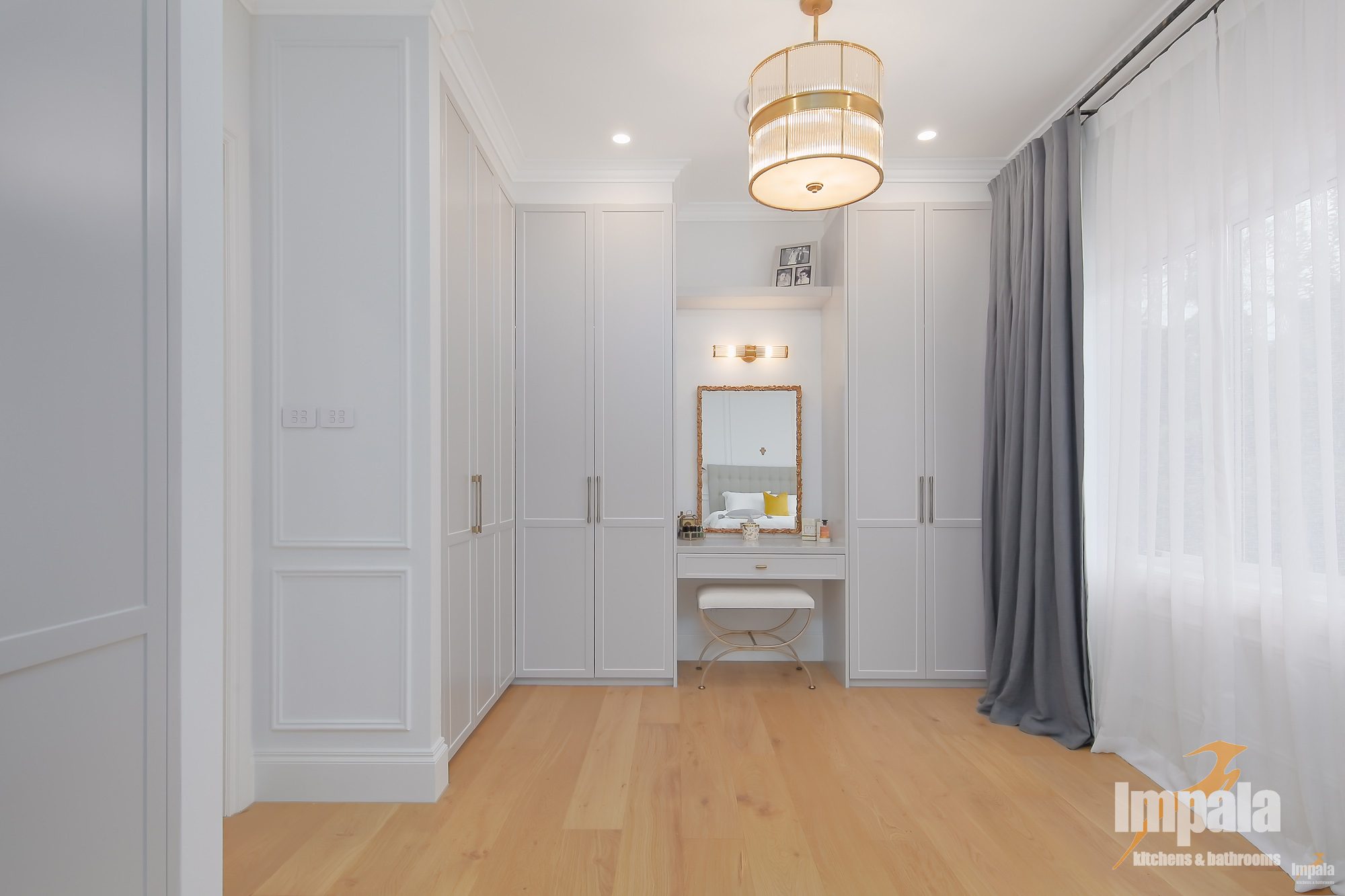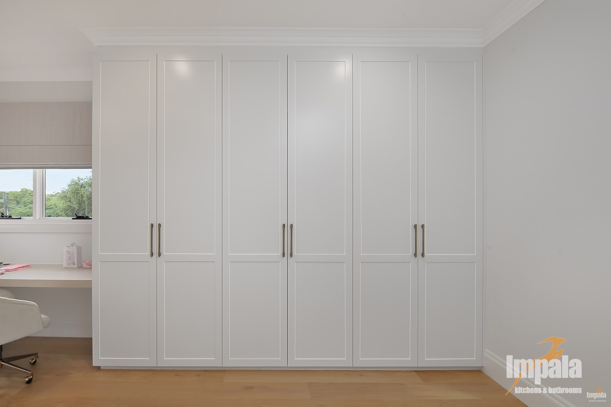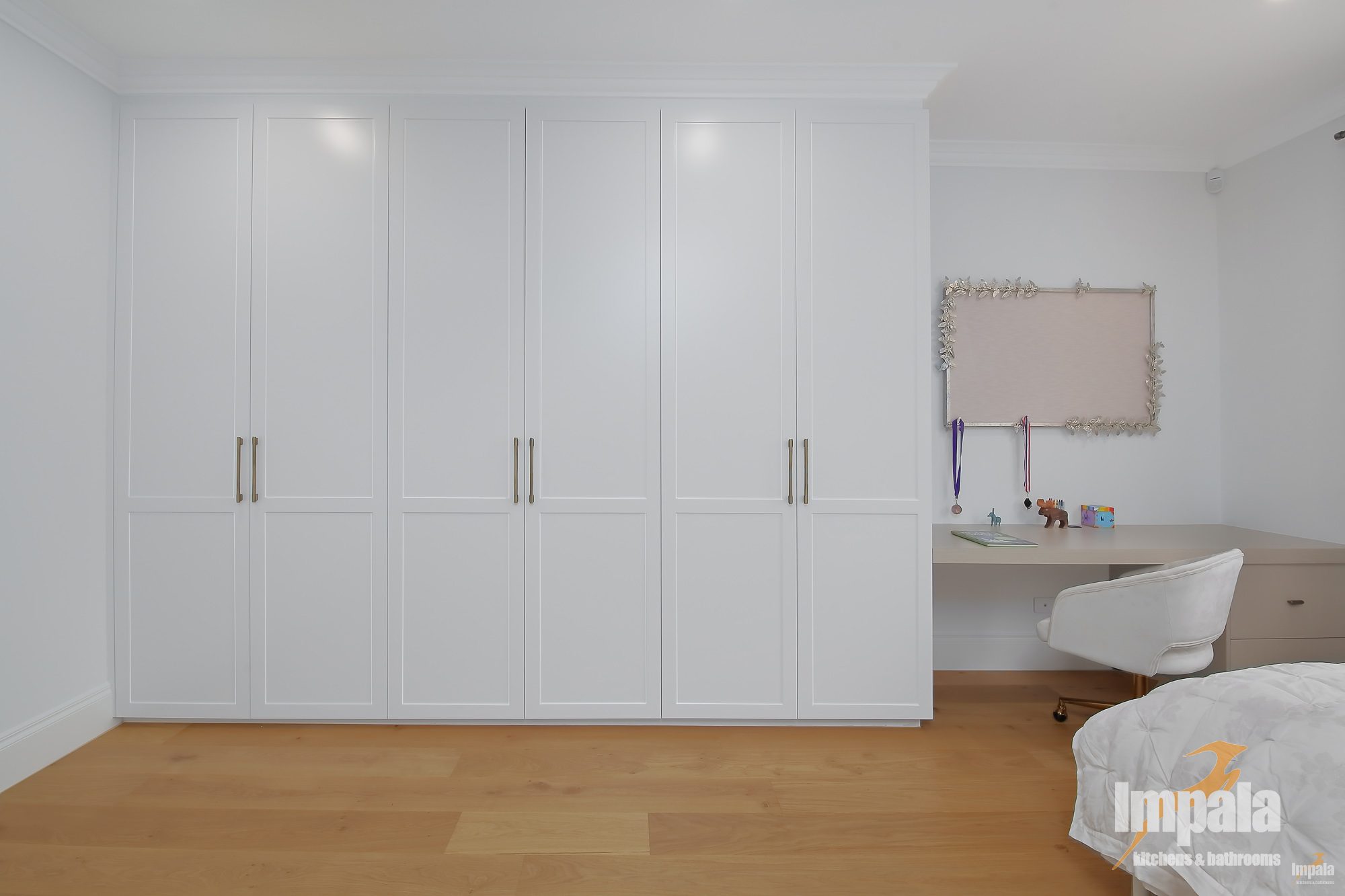 All four bedrooms have custom built wardrobes with the children’s rooms coming with built in study desks. We love the master bedroom, with a full wall of wardrobes plus dressing table. Beautiful shaker doors, with wall paneling and elegant handles brings such calmness and warmth to this large room.