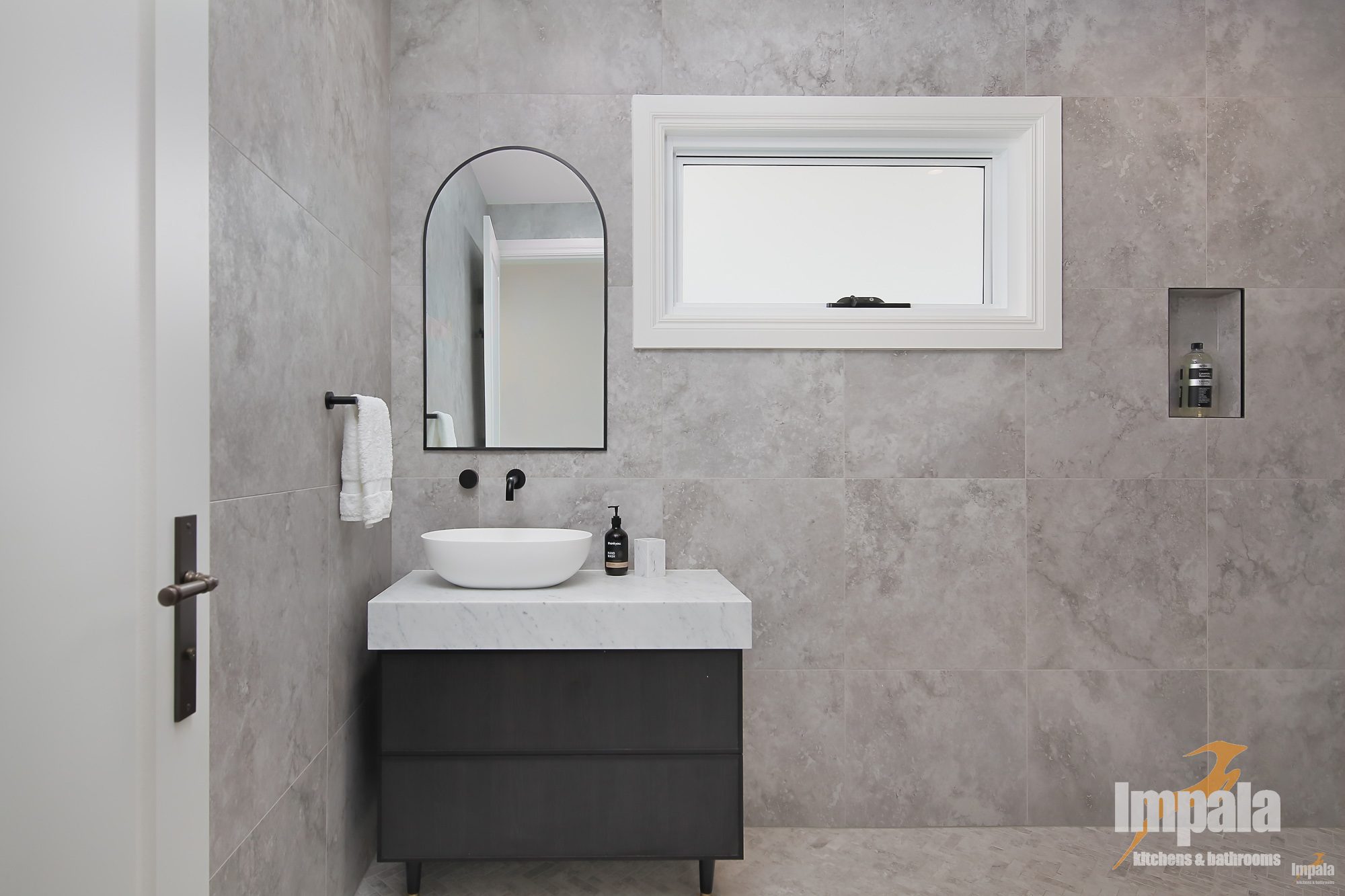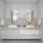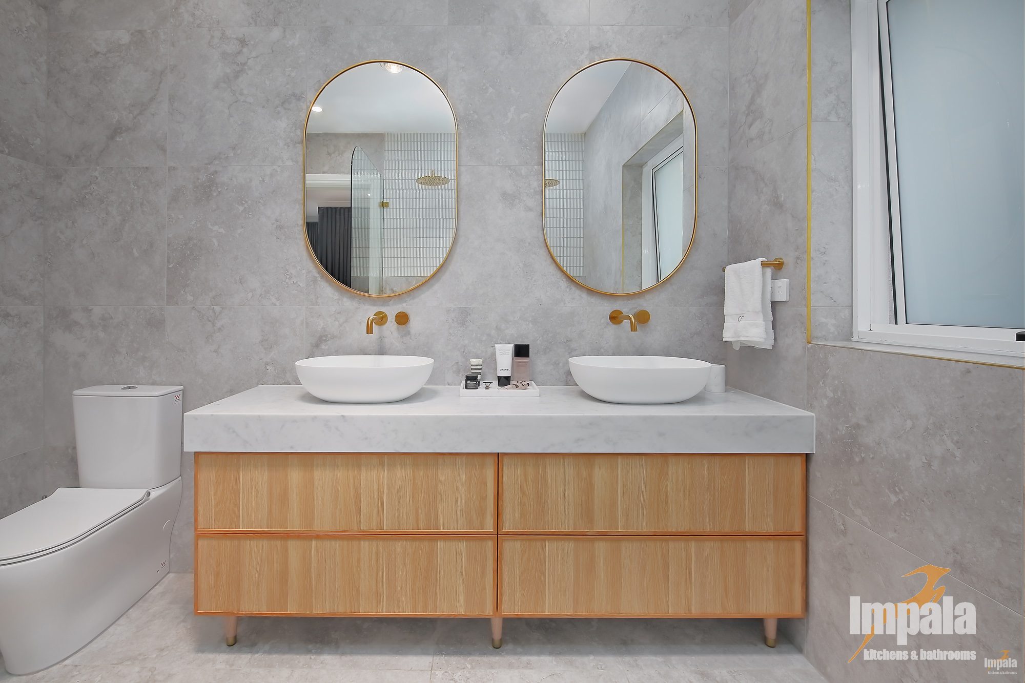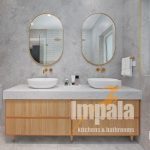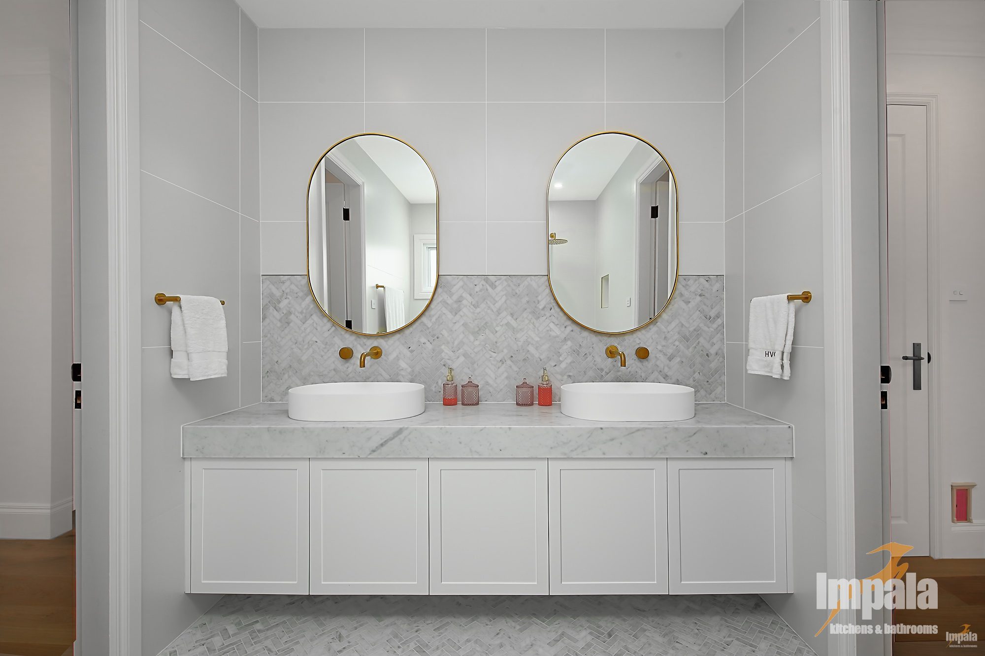 All four bathrooms were fully remolded. With custom built vanities in all. Each bathroom vanity is unique yet all focus on clean lines, with the same profile doors and stone tops, once again creating cohesion and demonstrating the benefits of custom vanities. We particularly love the powder room, while only small it shows you don’t need to compromise on style.