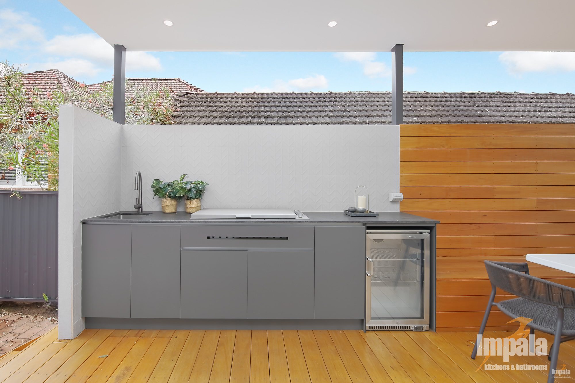 Outside custom cabinetry has been used on the outdoor area. With built in sink, wine fridge and BBQ it’s a perfect place to cook, entertain and relax with family and friends.