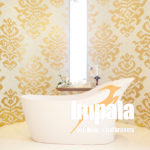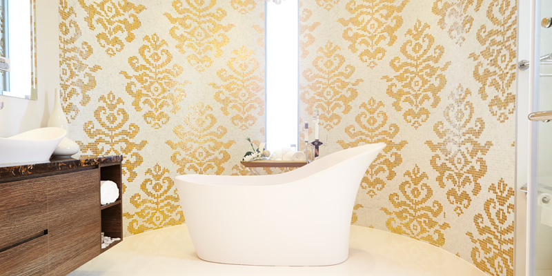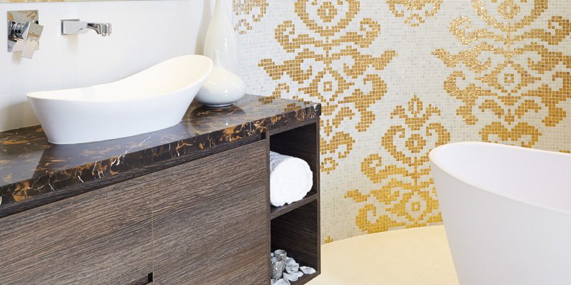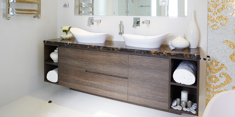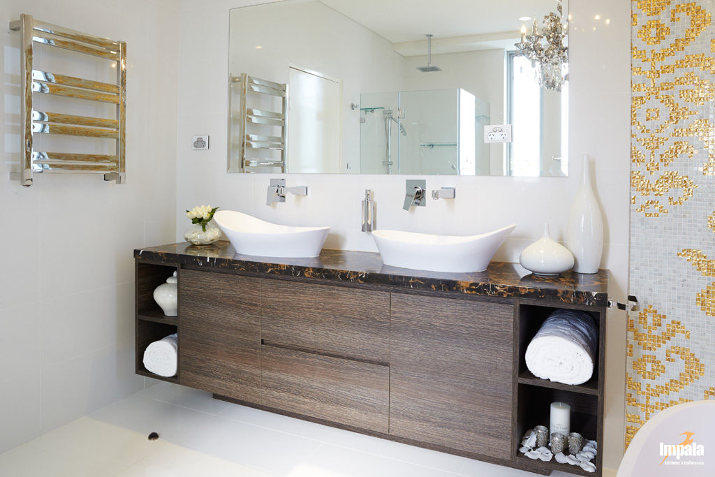 The client wanted to design bathrooms with a sense of opulence and luxury. Glamorous tiles, fittings and lighting was to be used in all bathrooms and a feeling of end-of-day pampering was to be captured. The client selected striking tiles for all three bathrooms and kept the vanity cabinets dark. Form and shape was important in the client’s selection of fittings. In the ensuite, the freestanding bath shape is also used in the vanity basins. The result is opulent and unique bathrooms which capture the client’s vision.
