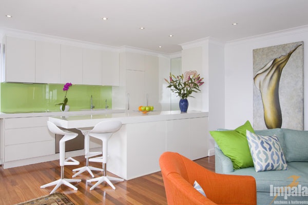 Impala’s clients were renovating an apartment in an exclusive development near the Sydney suburb of Bondi. The apartment is home to two adults who have downsized from their family house and who work from home. To this end, the study area and storage solutions were particularly important. The renovation did not require any structural changes but required extensive new finishes and custom joinery throughout the apartment. The client wanted neutral background colours with a splash of vibrant colour to add energy to the space. Impala was contracted to do all the joinery and the bathroom renovations in the apartment.