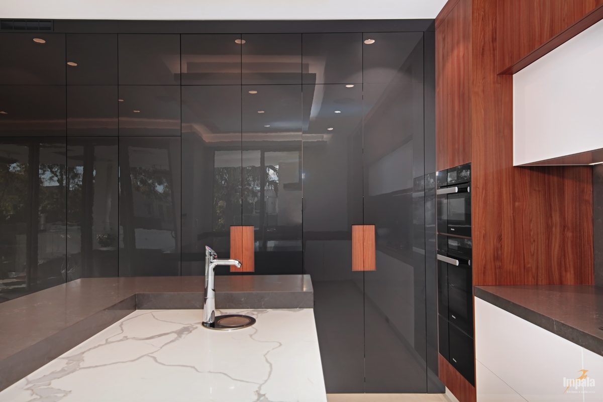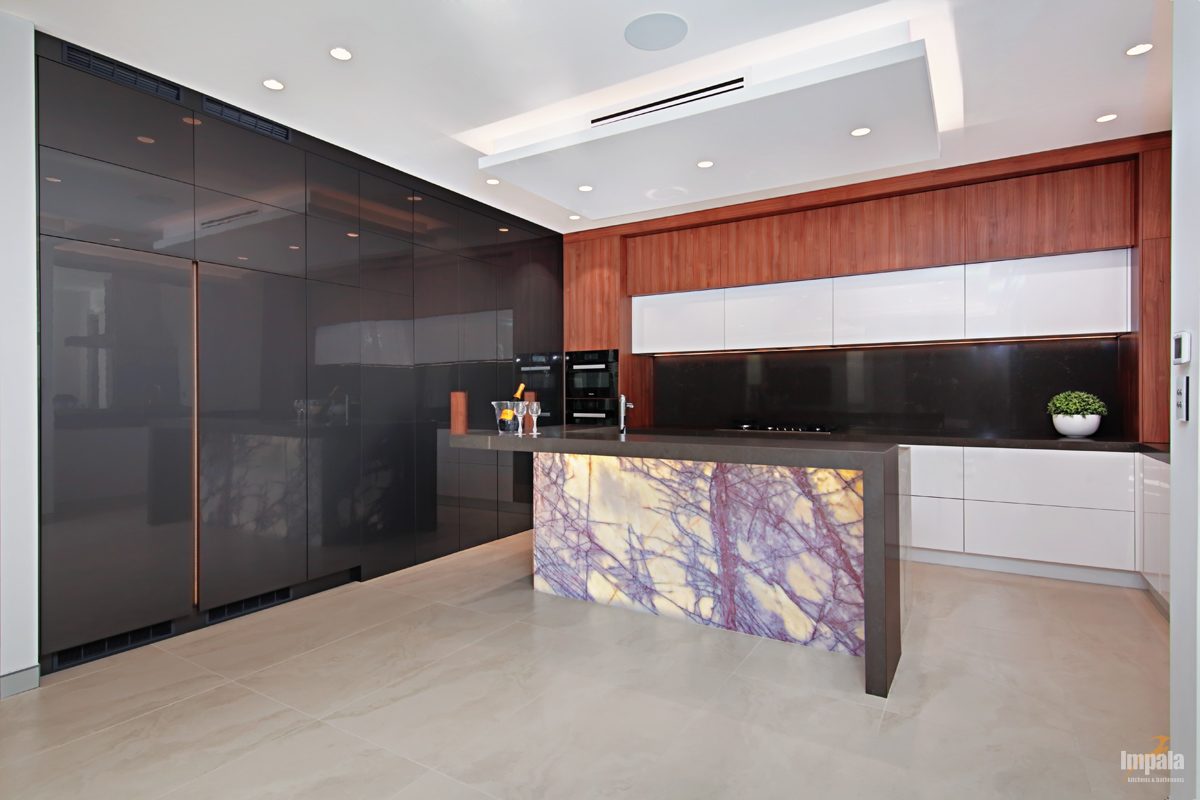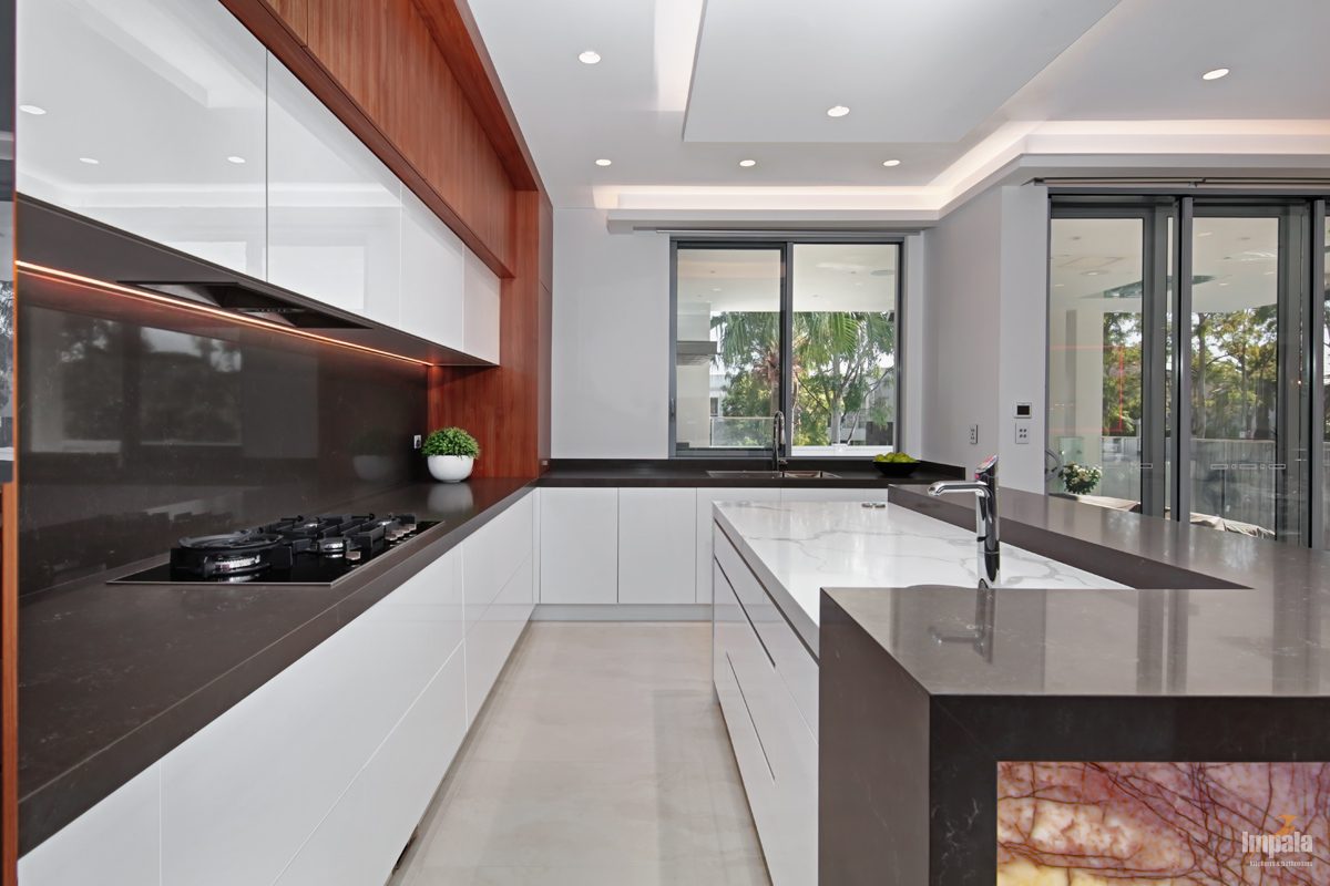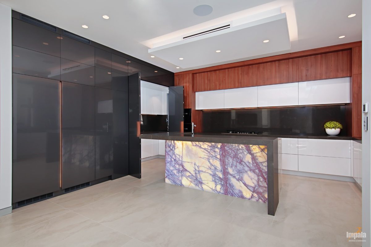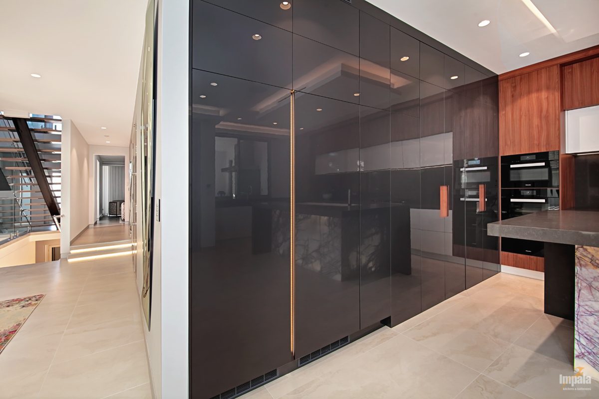 Glossy and luxurious surfaces with Minimalist, sleek, modern appearance defines the kitchen