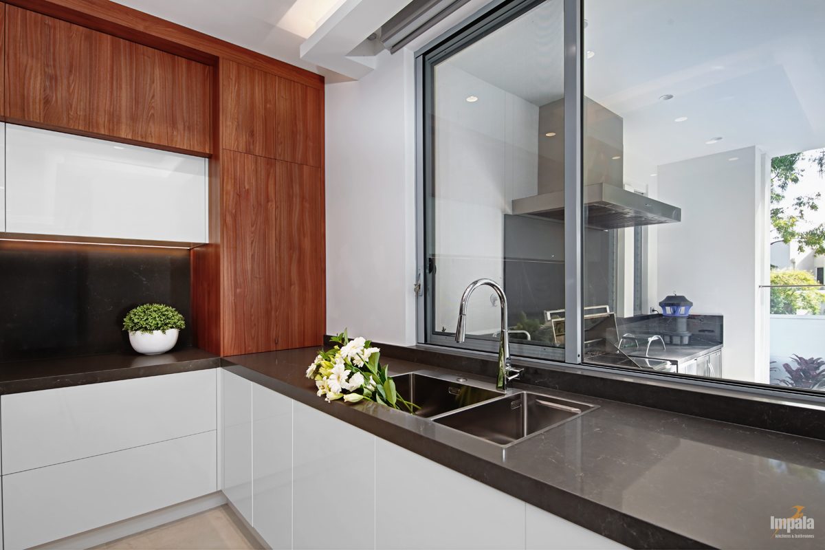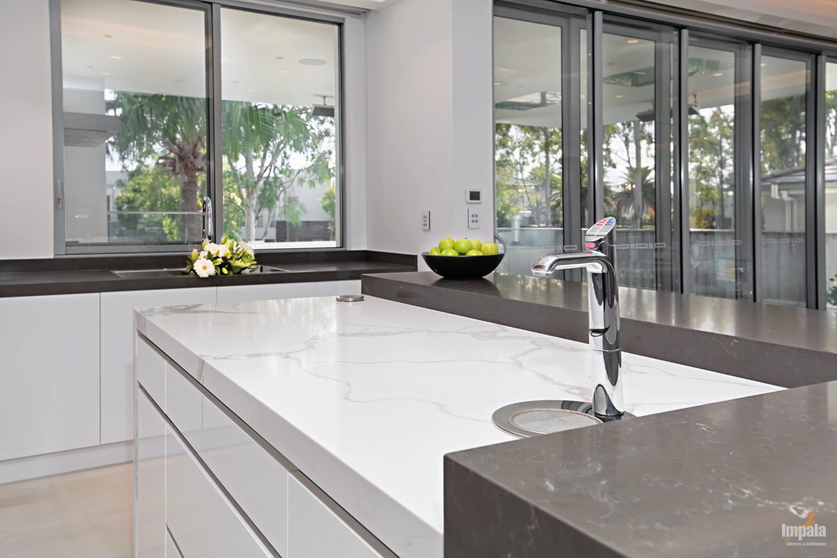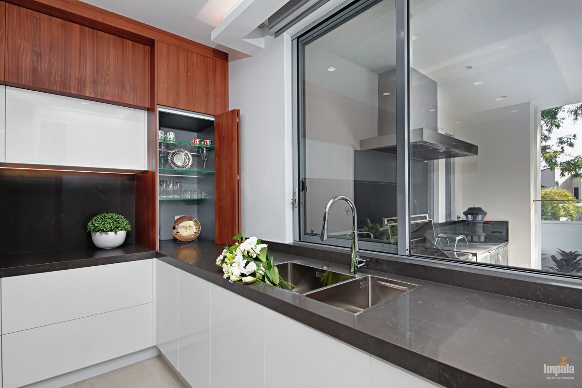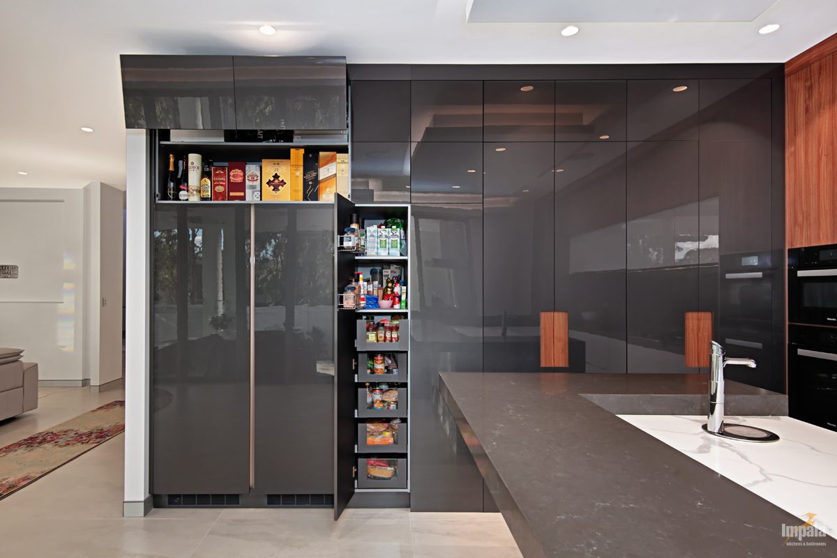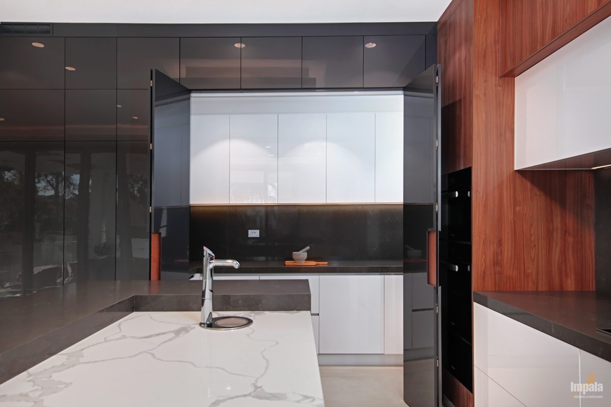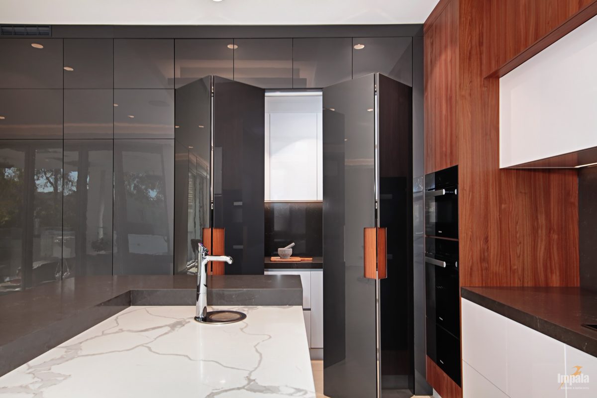 The cleverly concealed pantry has ample space with a second sink and dishwasher along with a large area for small appliances storage on benchtop