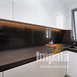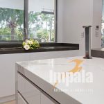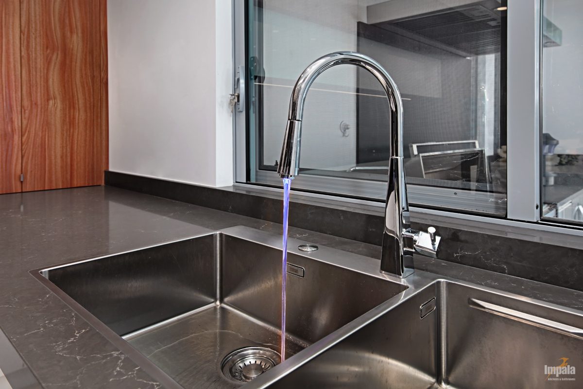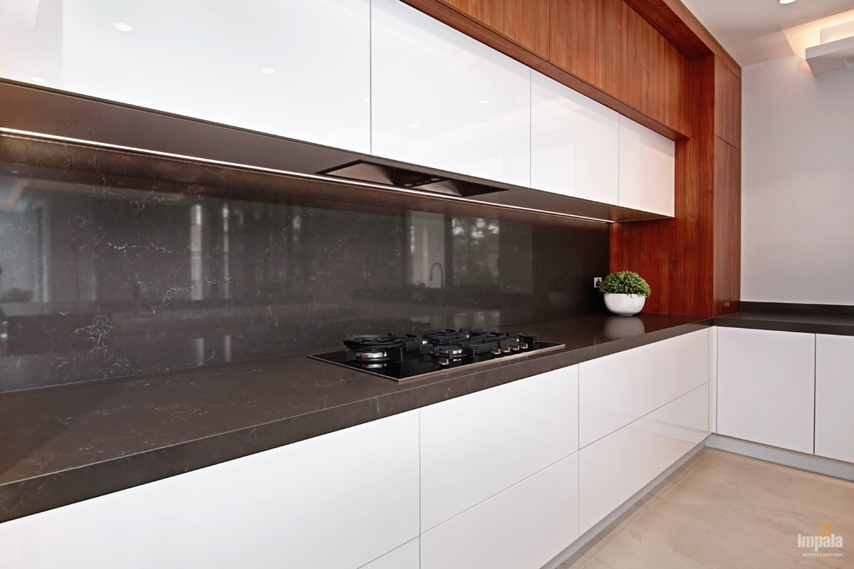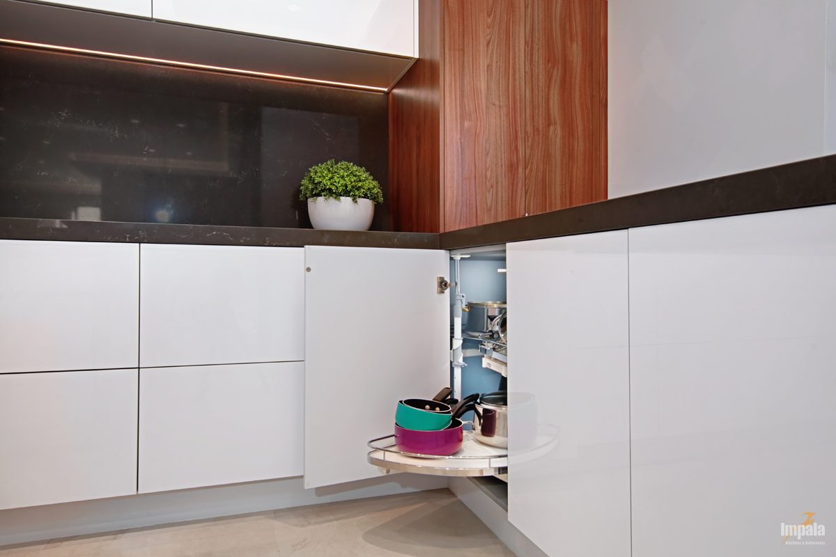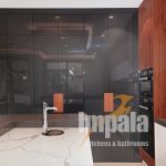 The complete kitchen is in flush doors with no handles and all push to open servo opening for wall cabinets