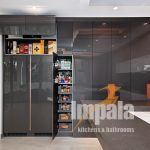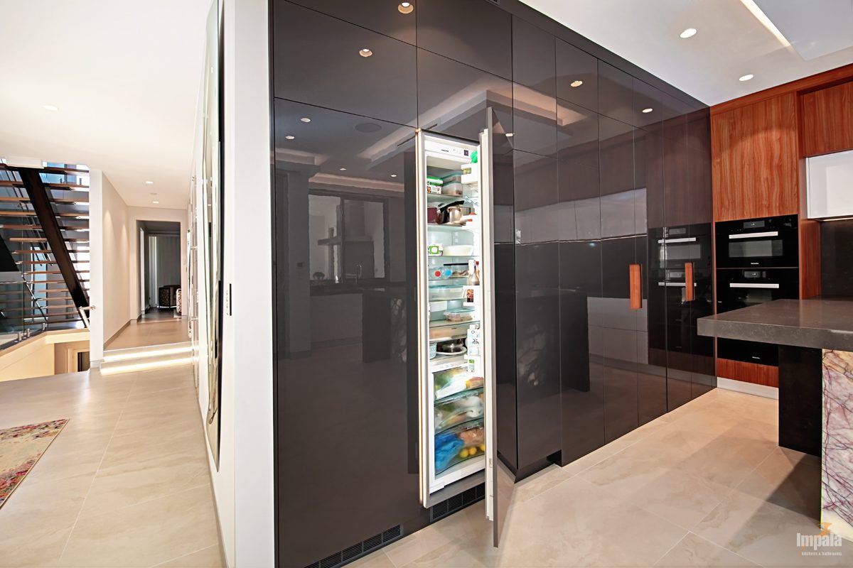 Integrated fridges and freezer along with matching doors leading to scullery form part of a minimalistic wall complementing the symmetry and clean lines of the kitchen