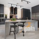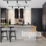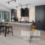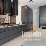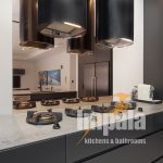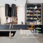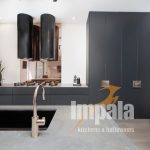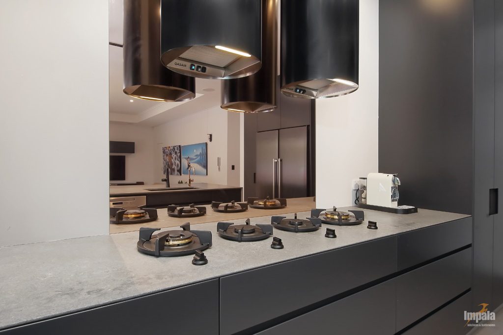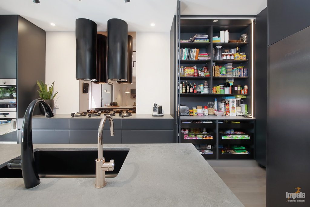 The open plan look was retained but without overhead cabinets. At 5100mm, the rear wall was long, with part of it obscured by the refrigerator and a nib wall, so a large pantry was designed, in this space, to allow storage of food and small appliances. It also contained an extra bench. This left the cooktop bench at 2800mm. A rose coloured mirror was installed centrally in this area. The dark joinery framing this space brought the long dark cylinders of the rangehood into 3D relief over the mirror creating a simple but dynamic effect.