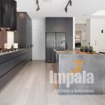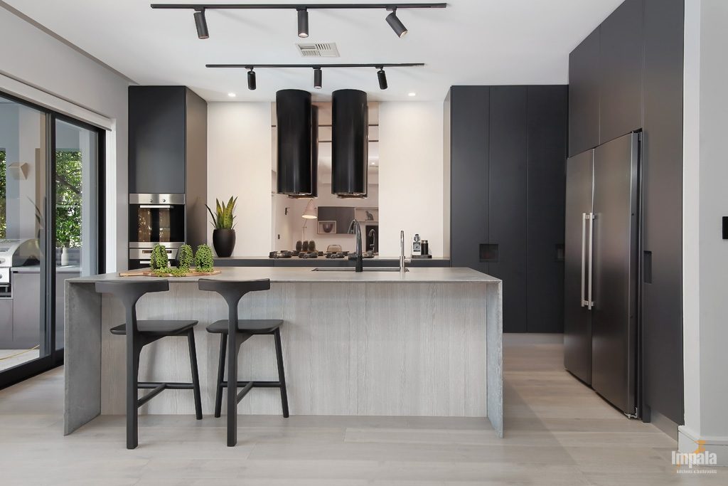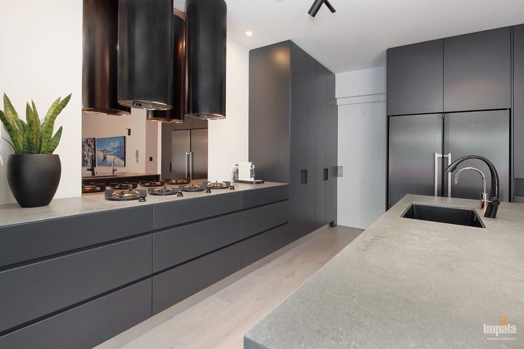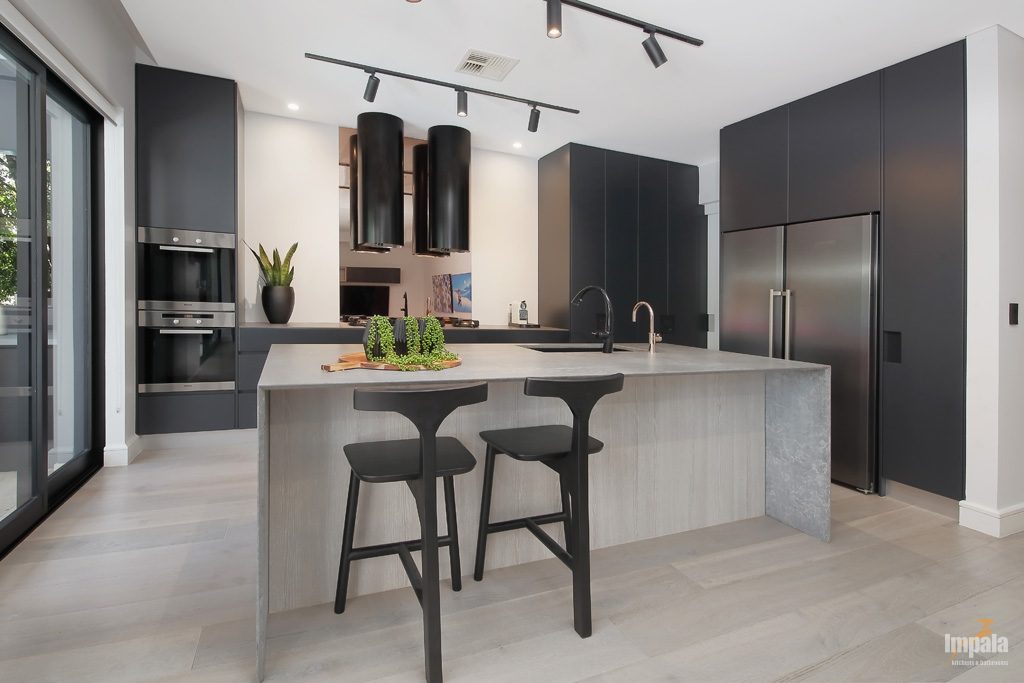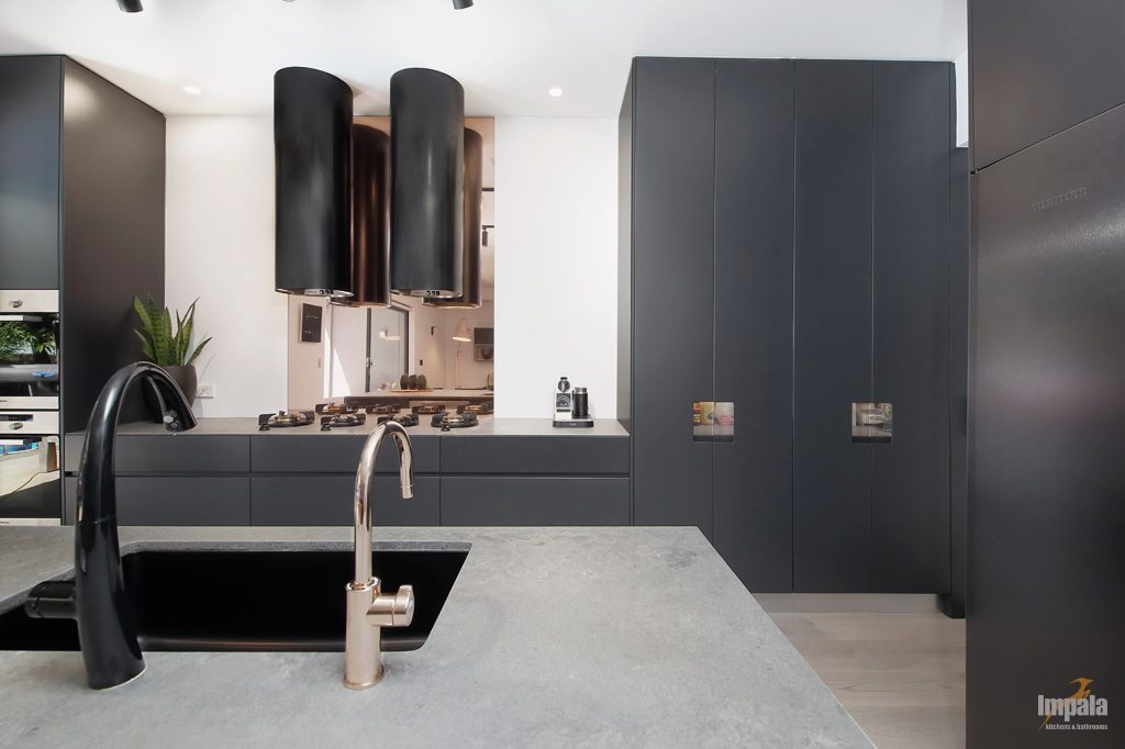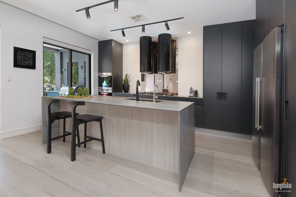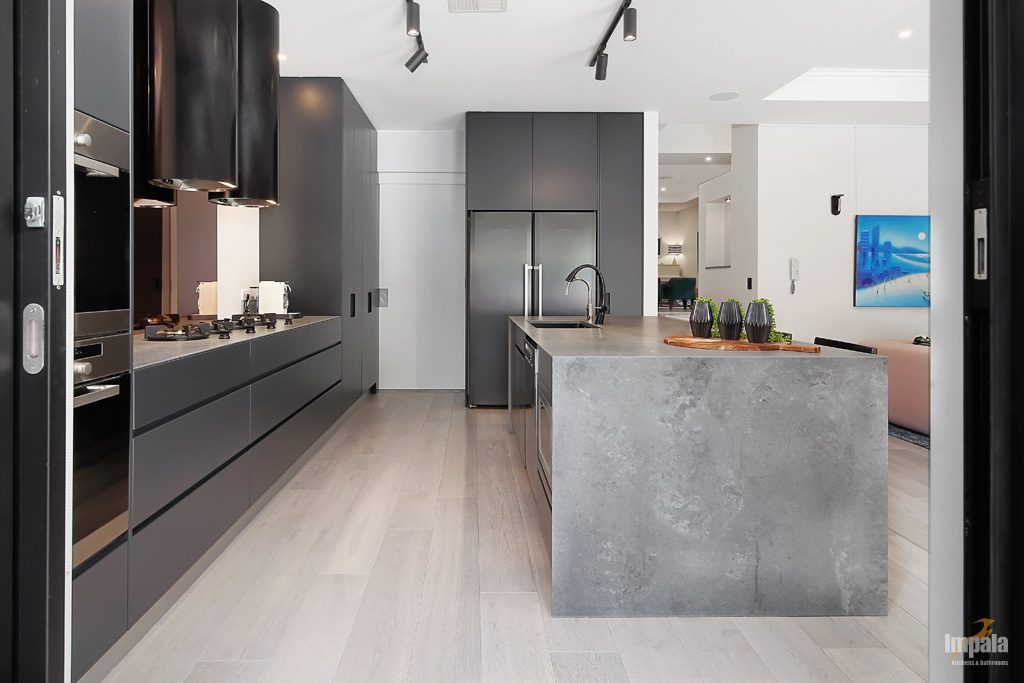 It also meant a new floor could be installed with a softer tone that blends seamlessly into the contrasting dark joinery and industrial tones of the concrete benches and cylindrical rangehoods.