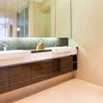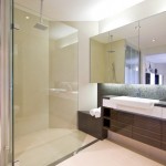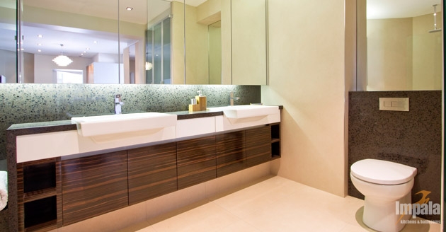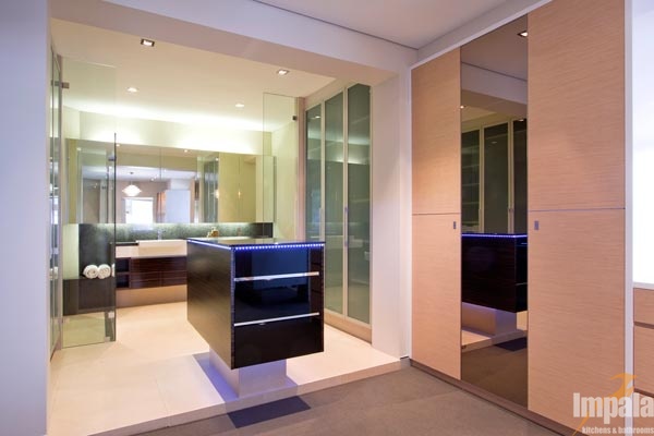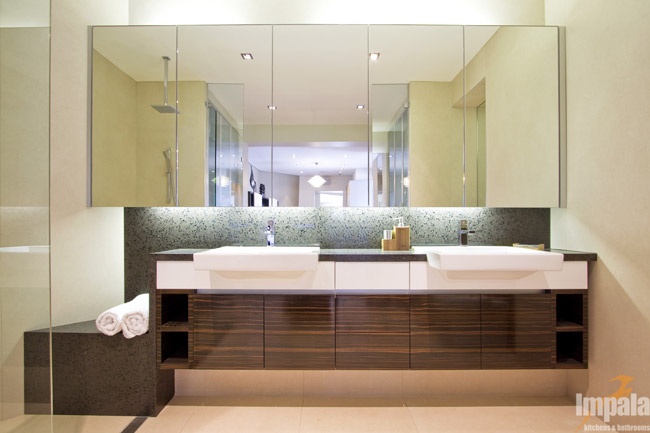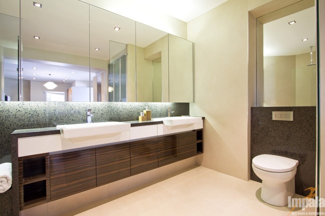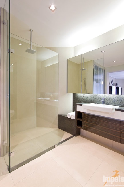 This contemporary bathroom is on display in our Brookvale showroom. The bathroom was designed to showcase Impala’s workmanship and attention to detail. It features cream Kerlite wall tiles and porcelain floor tiles. The vanity features gloss laminate doors with a Caesarstone top. An aluminium shadow-line creates handle-less opening. A sleek custom shaving cabinet with downlights set underneath and above creates maximum storage and provides ambient and task lighting to the space.Other features include a concealed toilet with a stone face, a stone hob in the shower area for seating/storage, a frameless custom showerscreen, a linear grate for shower drainage and under-floor heating. If you are looking for a contemporary style bathroom, we invite you to inspect our Brookvale showroom.