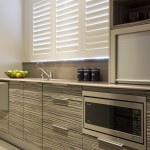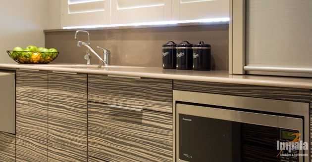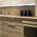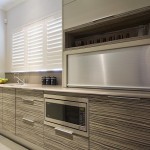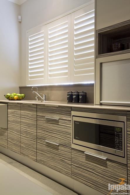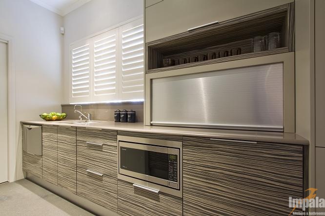 This contemporary kitchen is on display in our Brookvale showroom. The kitchen features lamiwood doors, 20mm stone bench tops and sliver kick boards.Other features include a sliver appliance roller shutter, under bench microwave and dish-drawer. If you are looking for a contemporary style kitchen, we invite you to inspect our Brookvale showroom.