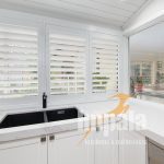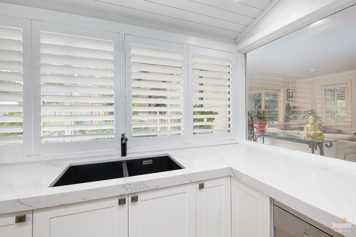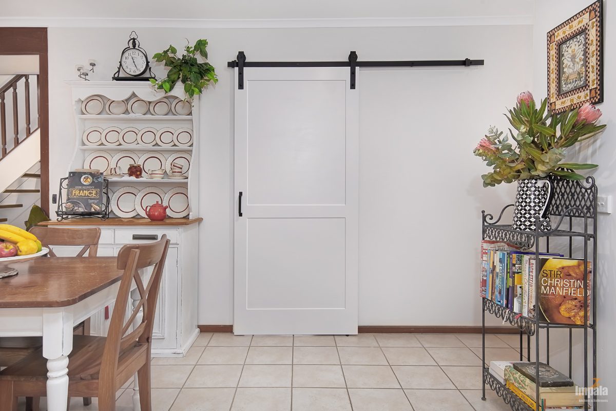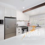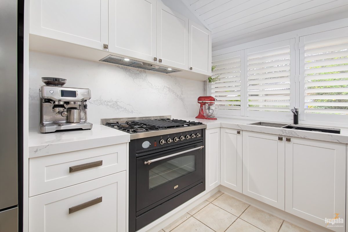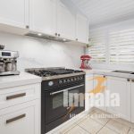Impala designer Rashi Mathur created a fresh look with shaker door profile in Natural White Satin. Beautiful Caesarstone Statuario Maximus was used on the benchtop, waterfall edge and splashback. The waterfall edge comes off a 3-meter bench creating a lovely statement. The Ilver freestanding oven and Schweigen rangehood is a cook’s dream. The Blanco double sink and tap in black provides a lovely contrast to the stone. A barn door was added to the dining room, creating harmony between the two spaces.
