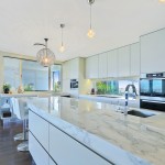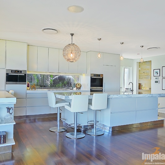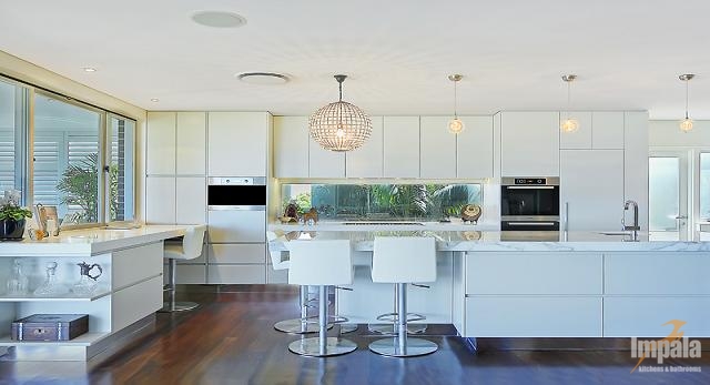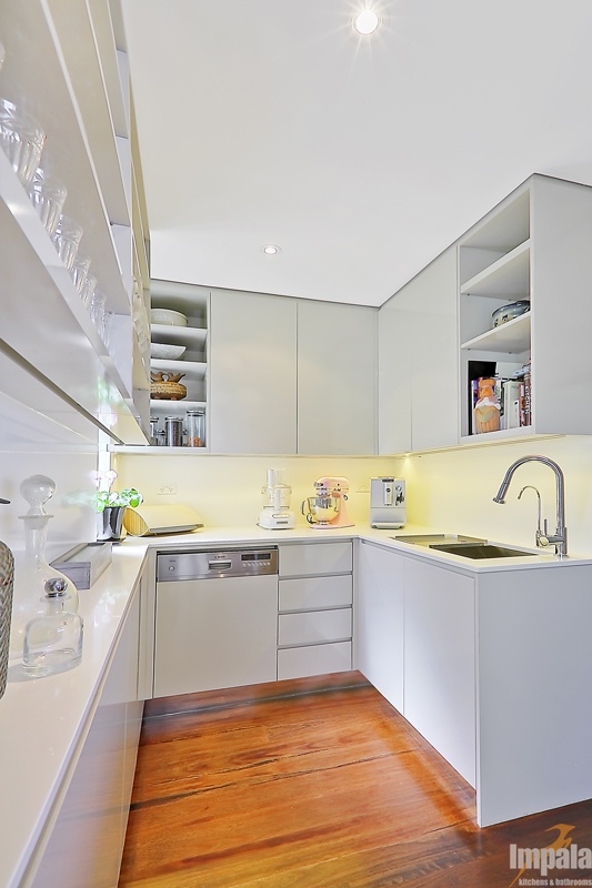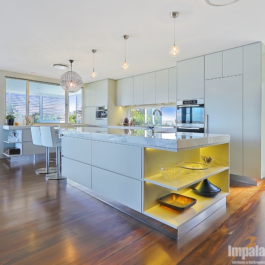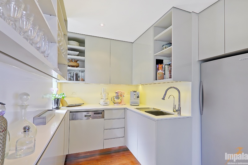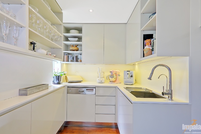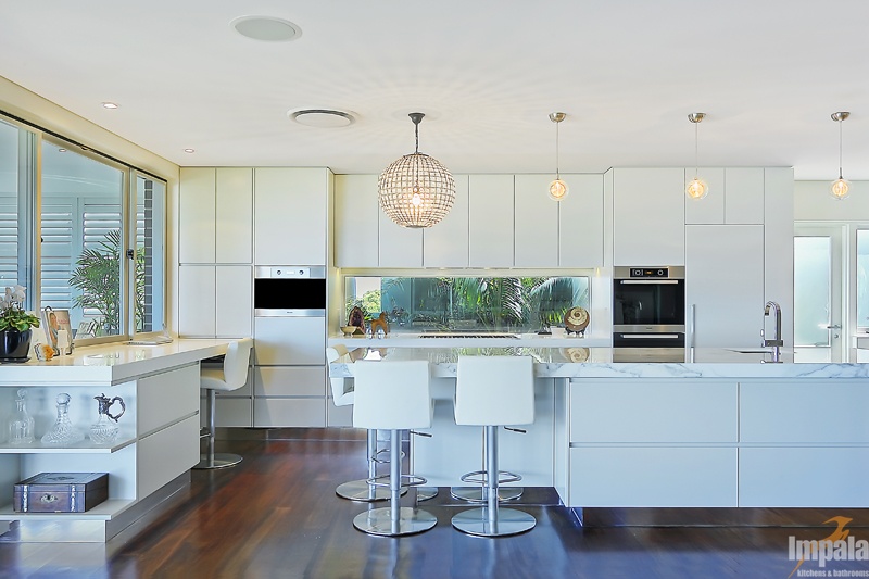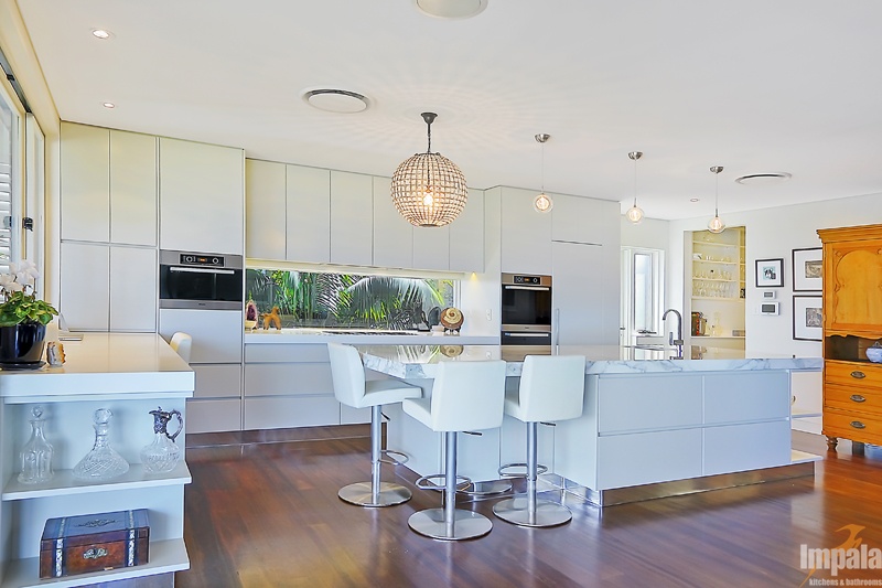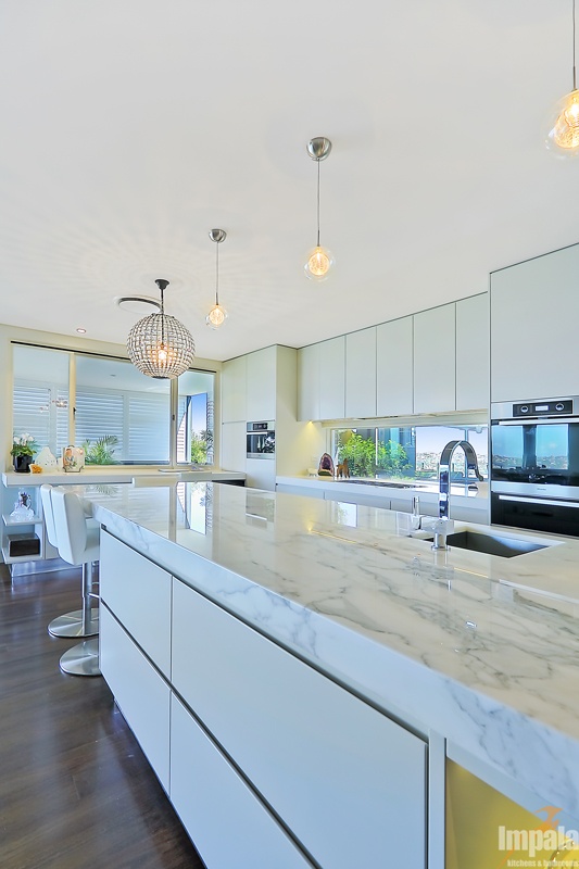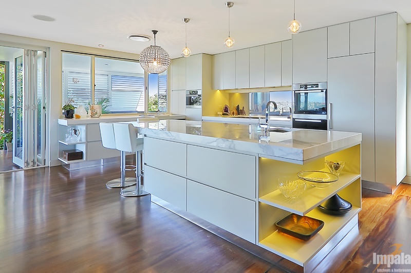 Our client purchased an older style home near the beaches in Sydney. The house was to undergo extensive renovation works to capture the home’s magnificent outlook and to suit her family composition and lifestyle. Functionality and aesthetic were key considerations in the kitchen design. Impala’s client had a background in interior design and our designer collaborated with the client and another design associate to bring together a practical kitchen layout using stunning finishes. Key to the kitchen aesthetic is the thick Calcutta marble bench top on the island unit. For pragmatic reasons, a different stone was used for the study area and either side of the cooktop. The open shelving on the island matches that of the long study area running underneath the window and allows the client to showcase objects collected over the years. The study area suits the small family as work or homework may be done here while other occupants are preparing a meal or snack. The computer and printer can be hidden in the cabinet to the left of the microwave. The kitchen cabinets appear to be floating with the use of a mirrored kickboard. A scullery was also built with sink, dishwasher and a second fridge where preparation tasks and dishwashing can be hidden from guests and affording additional storage.