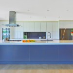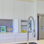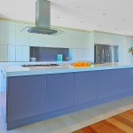 The client requested a neutral main colour with a feature hue for the island and matching glass splashback. The bench top was all about practicality. The client chose Corian for its hard-wearing properties and contemporary aesthetic. Critical to the modern, sleek design was that the kitchen has no handles anywhere, also making it easier to clean and wipe doors.
