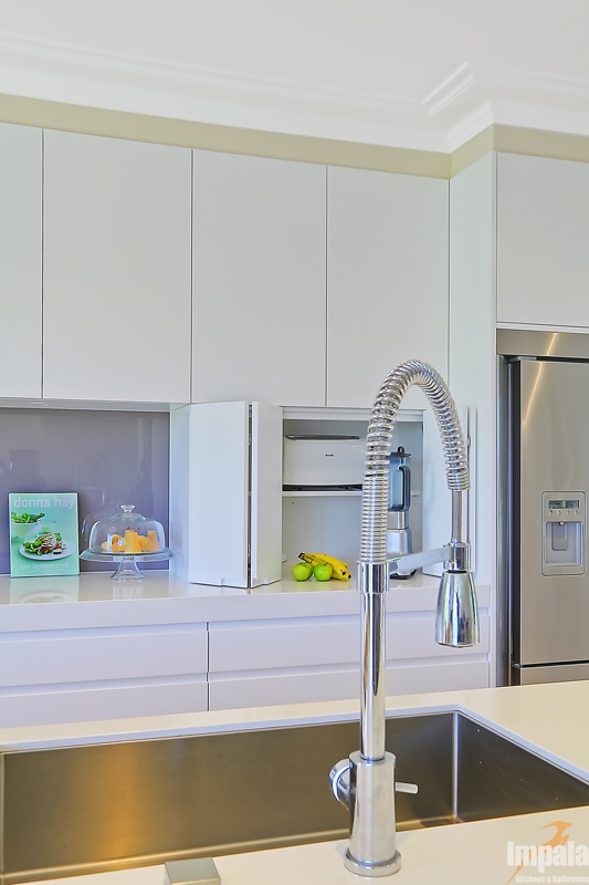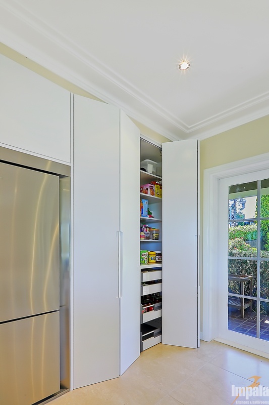 To meet the brief, Impala built cabinets to the ceiling, maximising storage. The client requested two full side fridges side by side (hinged at opposite sides) and these were built into the tall cabinets.
