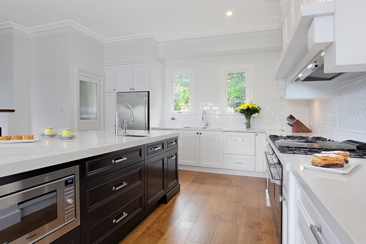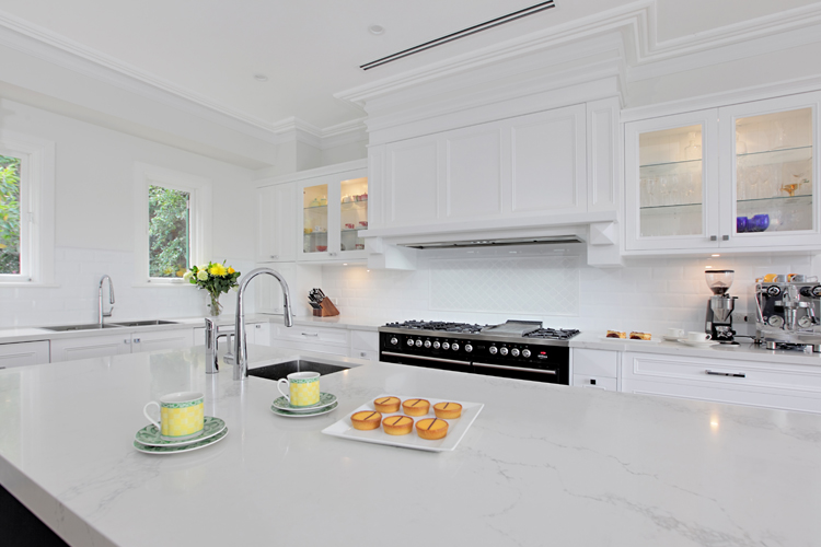 • The stone top selected was central to the look the client wanted meeting the requirements of heritage/hamptons, bringing in warmth to the stark contrasting cabinetry colours.