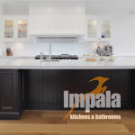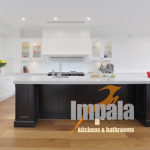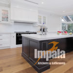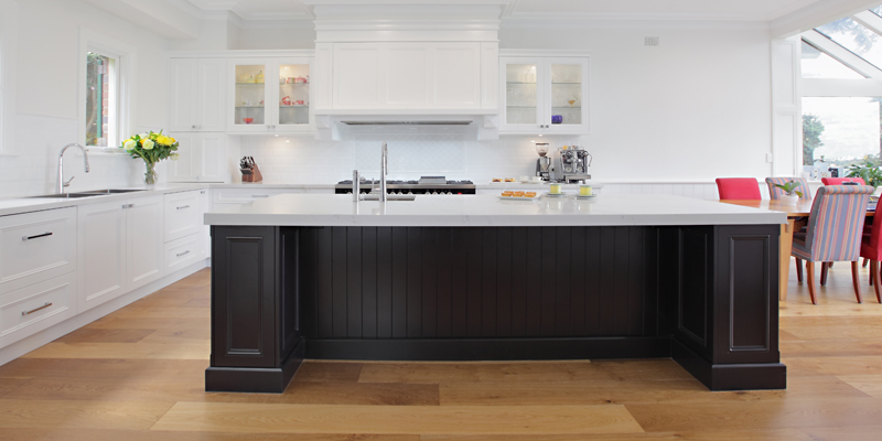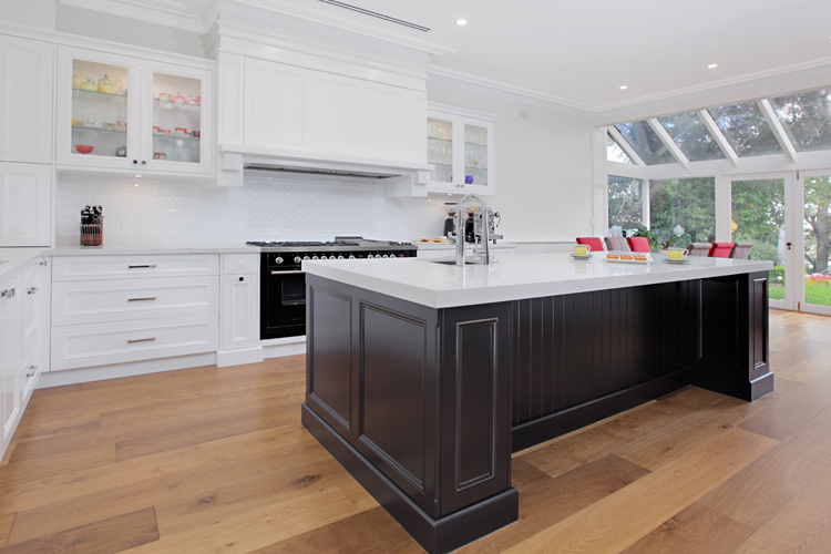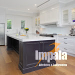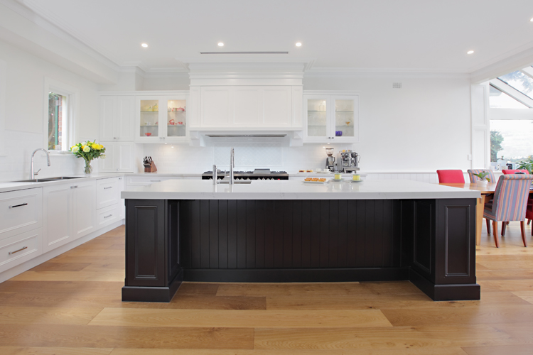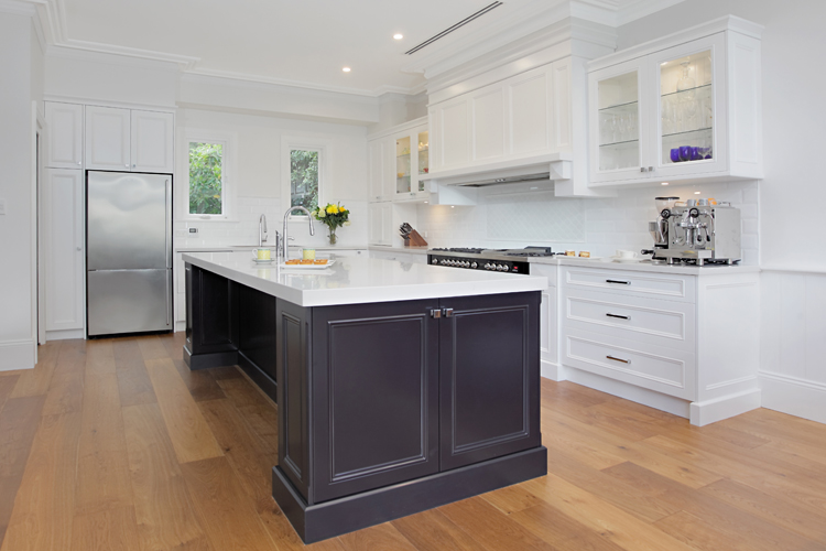 • A large island for seating whilst the adults were cooking. The island was done in a striking dark colour (Dulux Klavier) to address the client’s brief “not all white!” and in keeping with the requested Hamptons style.