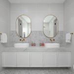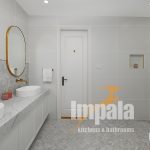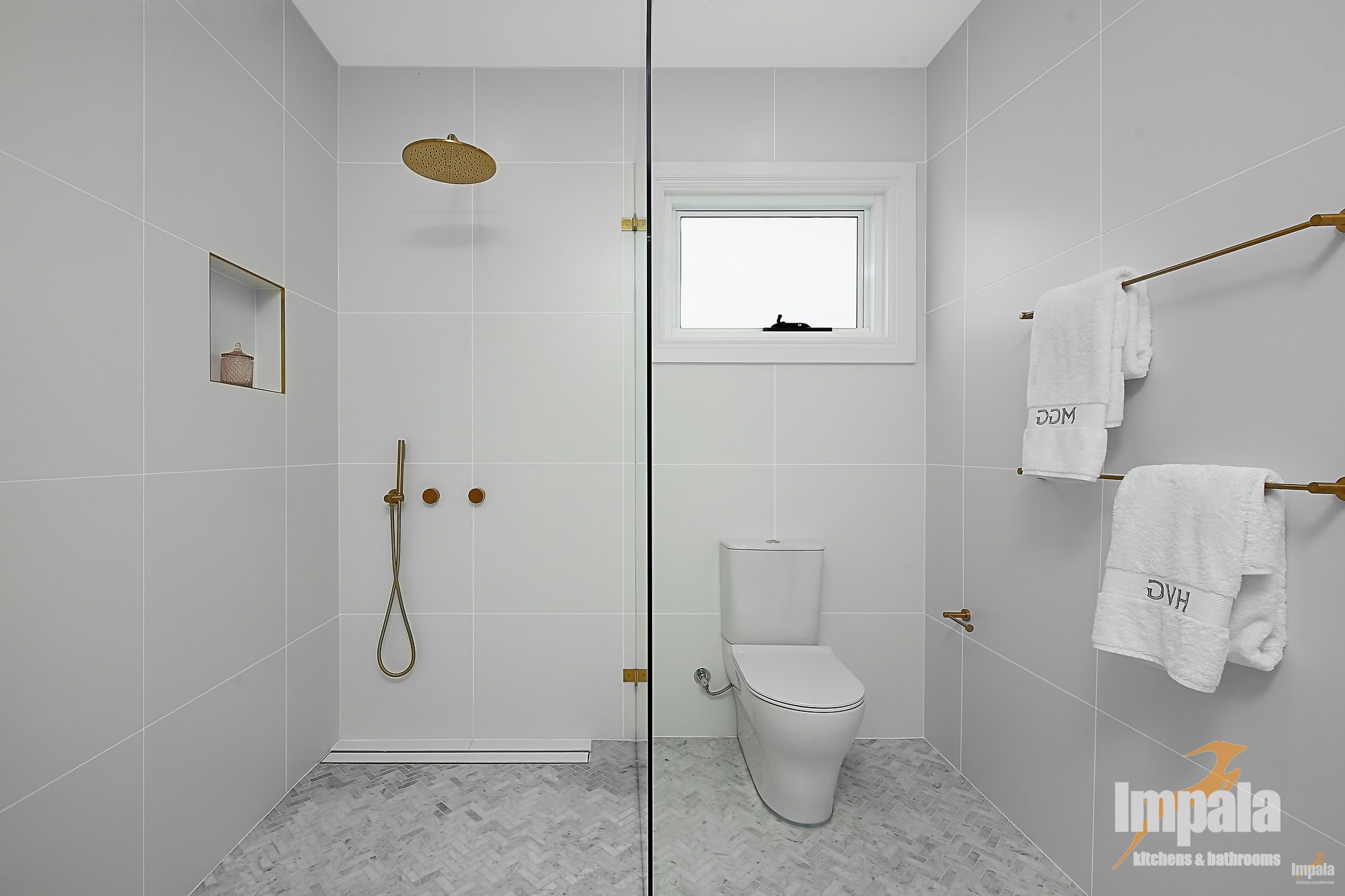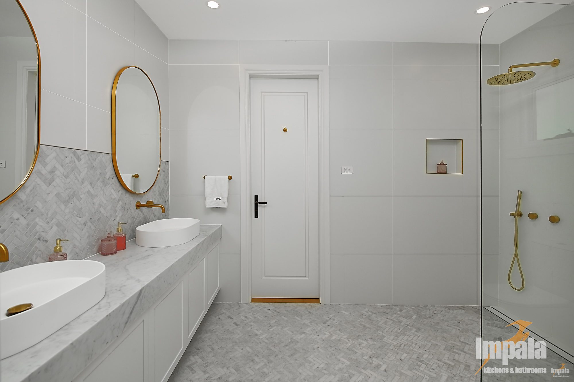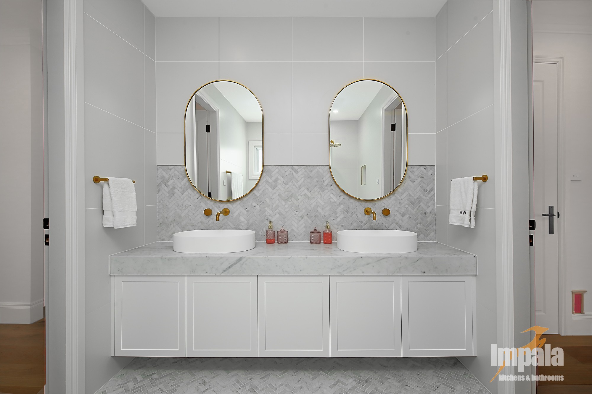 The custom vanity at 2.6 meters leaves plenty of bench space while still accommodating double sinks. In additions there is loads of under cupboard storage. We love the 80mm think Carrara Marble vanity top with a mitered apron edge profile, reflecting quality and style.