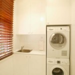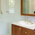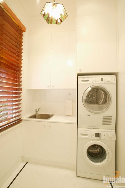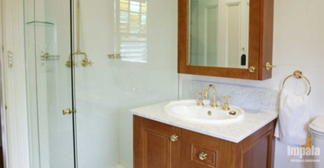 Impala designed a solid jarrah timber vanity and shaving cabinet. The vanity has proud kickboards and routered door profiles with brass knobs to match the fittings and tapware. A marble stone top was selected for the vanity bench. Simple while lamiwood cabinets were designed in the laundry with white ceramic knobs. A 20mm marble top was installed on the laundry tub cabinet.