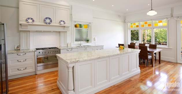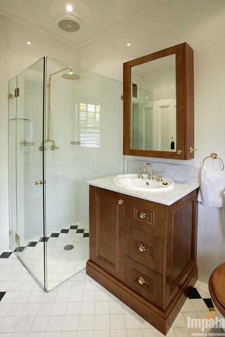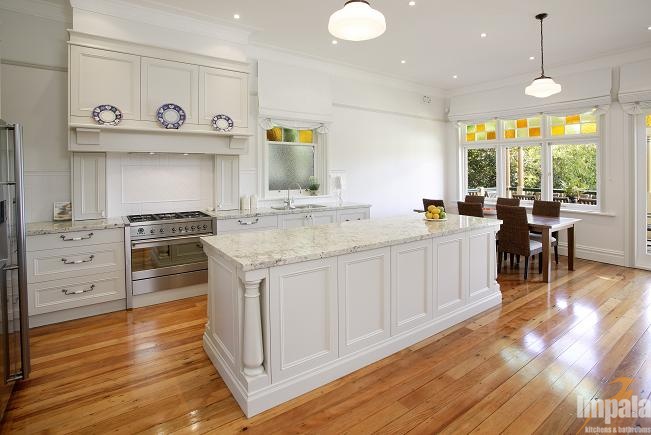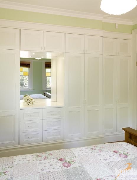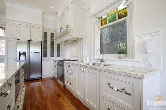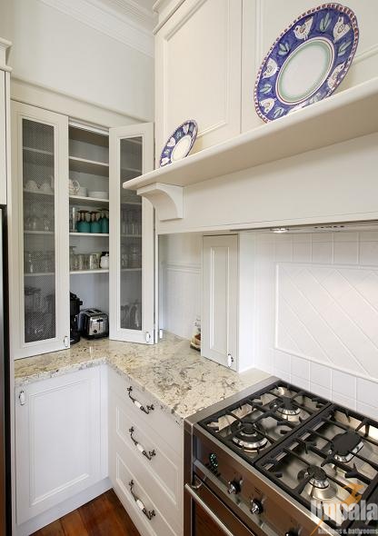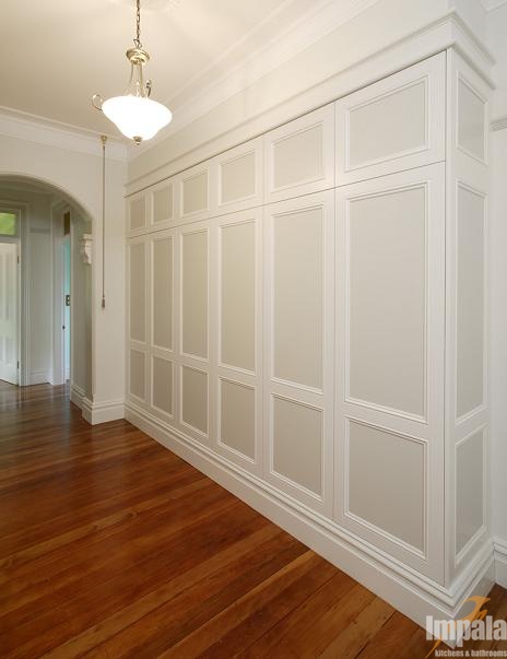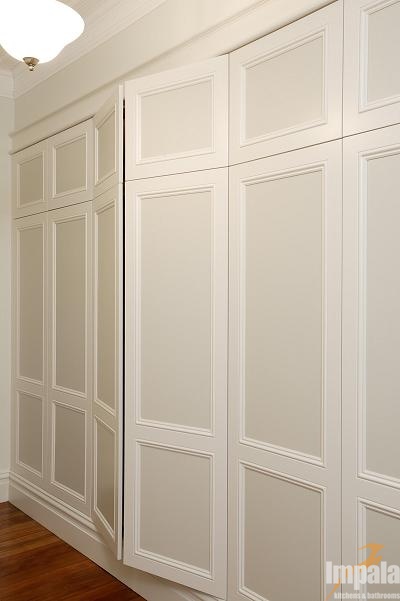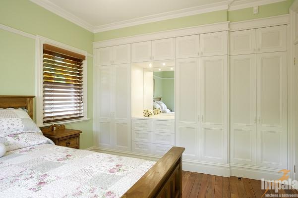 Our client was renovating a heritage listed house on Sydney’s lower north shore. The house was a traditional, federation style with lead lights, ornate ceilings, original timber floor boards, detailed cornices and high skirting boards. The client wanted to renovate with the home’s architecture in mind. The client requested Impala to design a detailed federation style kitchen with luxurious finishes such as a granite top and detailed handpainted doors. A butler’s sink was requested as were mesh-fronted display cabinets, proud kickboards and pilasters. The wardrobes were to match the existing style of the home and were to appear as hall panelling. These were also handpainted. Bedroom wardrobes were designed with the home’s period character in mind.