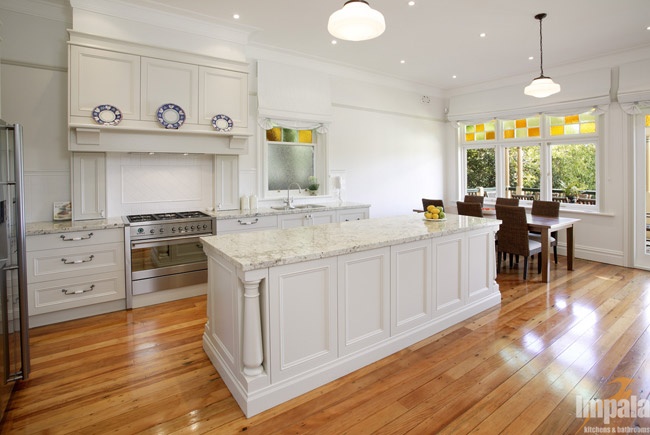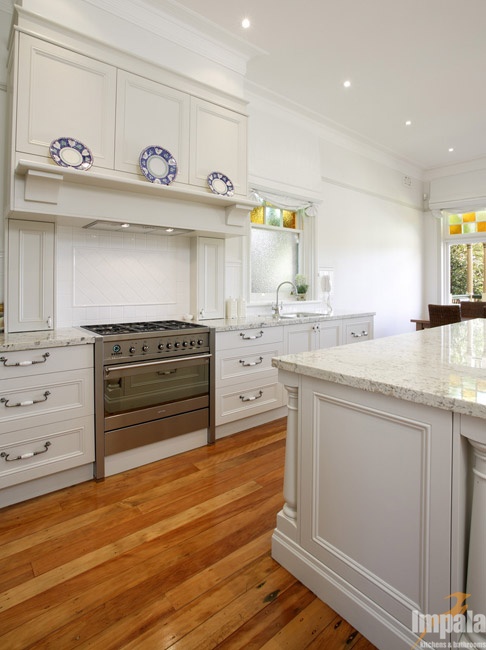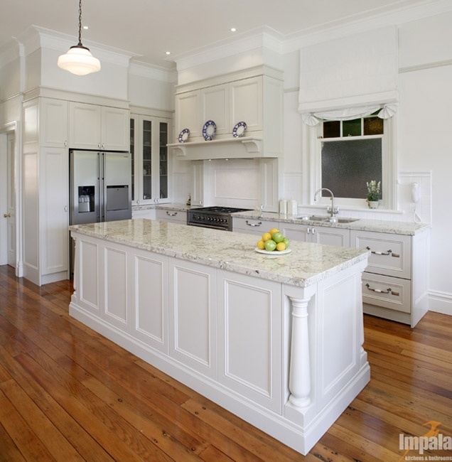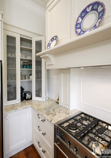 Our client was renovating a heritage listed house on Sydney’s lower north shore. The house was a traditional, federation style with lead lights, ornate ceilings, original timber floor boards, detailed cornices and high skirting boards. The client wanted to renovate with the home’s architecture in mind. The client requested Impala to design a detailed federation style kitchen with luxurious finishes such as a granite top and detailed handpainted doors. A butler’s sink was requested as were mesh-fronted display cabinets, proud kickboards and pilasters. Impala was also engaged to design and build further joinery for this home as featured under our whole house area.