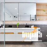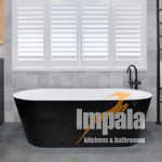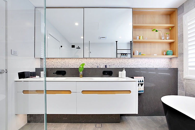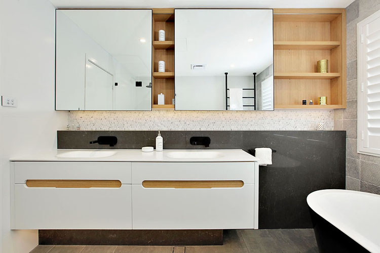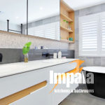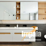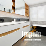 The client commissioned Impala to design joinery throughout the house, including the kitchen, laundry, vanities, outdoor kitchen, bedrooms and wardrobes. Impala designed, built and installed the joinery on this project as well as co-ordinating all associated trade-work. Although built in the 80’s, the home is a contemporary split level master-built dwelling, which enabled contemporary design and finishes. The client loved the finishings in our Drummoyne showroom and requested these in their design brief. The metallic tiles, corian moulded basin and dark nib-stone wall were all incorporated. Andrew Wright (Impala’s designer) came up with the layout which involved knocking out walls and building new nib walls for the shower, in-wall cistern toilet and wall mounted vanities. The large shaving cabinet is a practical storage unit as well as display cabinet. The mirrors are large and slide across the open teak shelving – eliminating the need for small hinged shaving cabinet doors. LED strip light was installed to allow for task and ambient lighting. Black fittings were used, including a striking free-standing bath tub, black tapware from Astra Walker and a floor to ceiling Hydrotherm heated towel rail. The double basins are moulded in corian, great for cleaning. The result is a spacious and practical bathroom for the family’s three children.