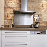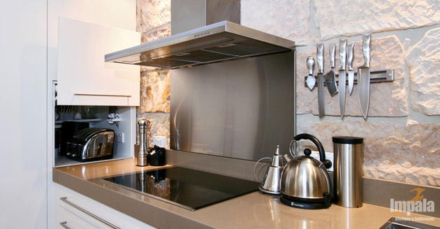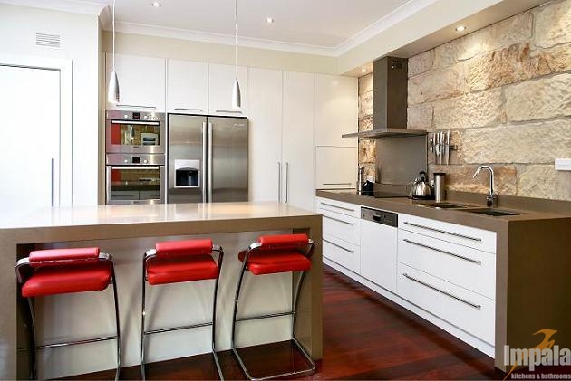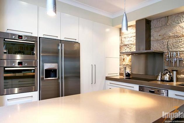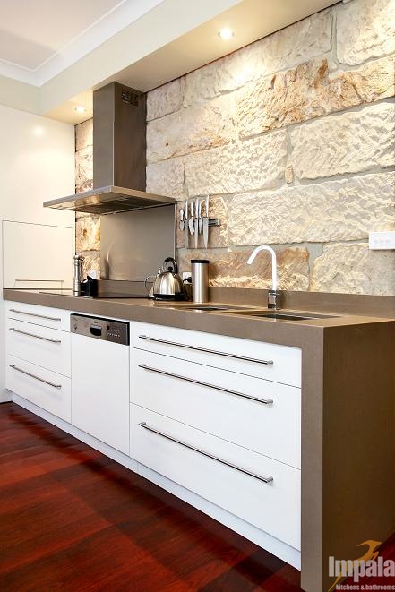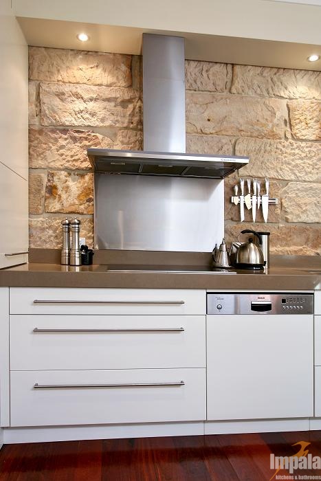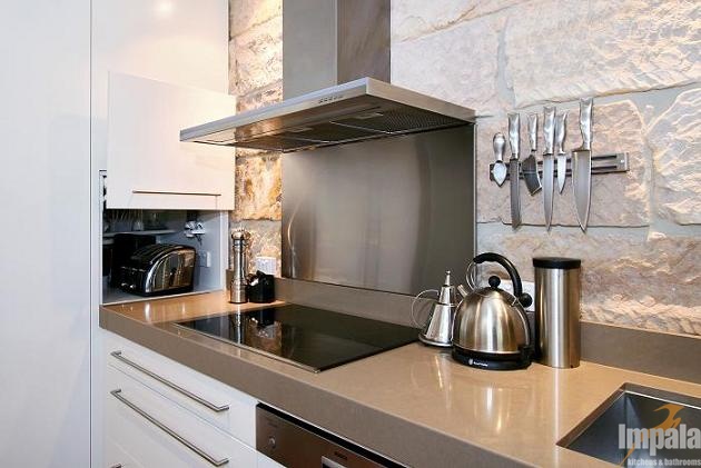 To provide ample storage, Impala designed a kitchen with tall cabinets adjacent to the ice-maker fridge and wall oven tower. The tall pantry also has access from the bench top for small appliances which can be closed to hide clutter. The feature sandstone wall was left visible and lighting was installed in a bulkhead above to highlight the wall and provide functional light when cooking or washing up. A stainless steel splash was installed behind the cooktop to protect the sandstone.