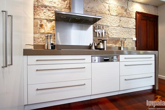 Impala’s clients were a family with two small children who were renovating an old sandstone cottage in Sydney’s inner west. The kitchen was to be sympathetic with the homes’ character and architecture, yet modern and contemporary. The client brief was for storage as the old kitchen afforded little and to allow for seating at an island unit for the kids’ breakfast and snacks as well as an area for homework to be done whilst dinner was being prepared.
