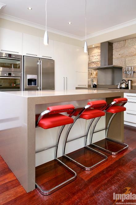 The island provides a functional working and eating space with seating as requested in the client brief. Impala recommended a thick stone bench top and waterfall ends to the joinery to balance the design elements and provide a degree of proportion with the large original sandstone blocks.