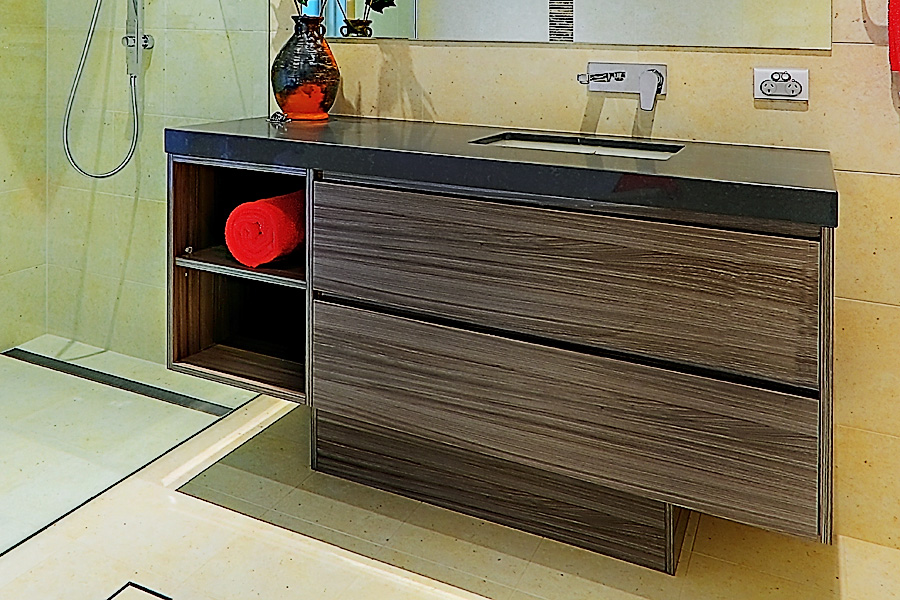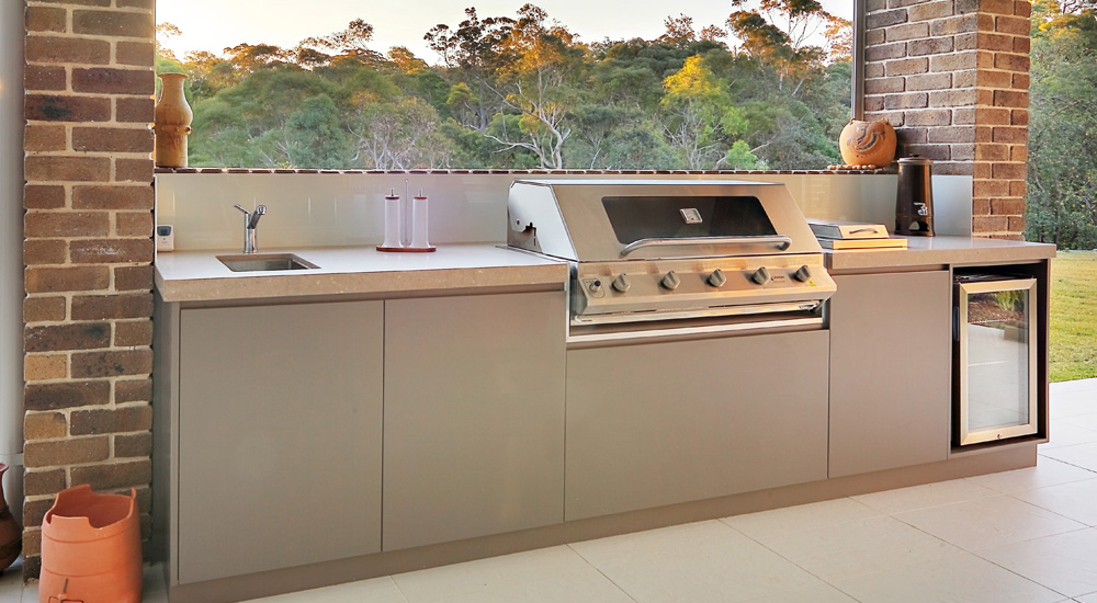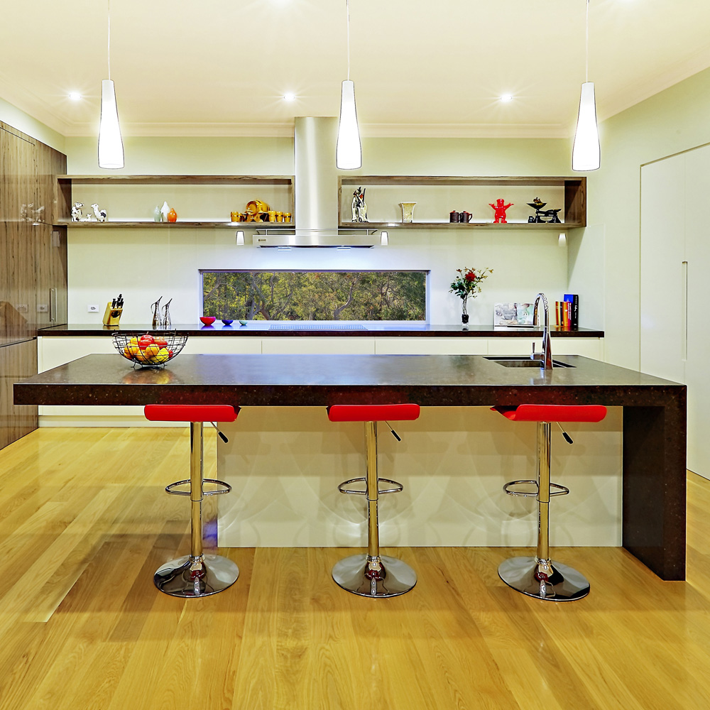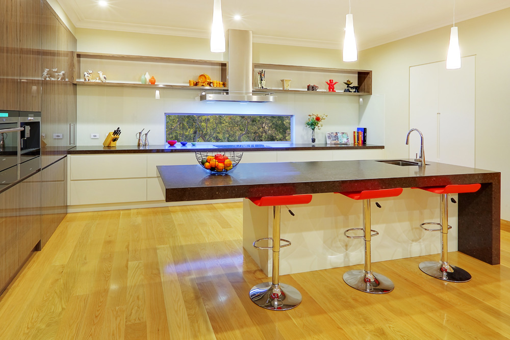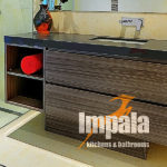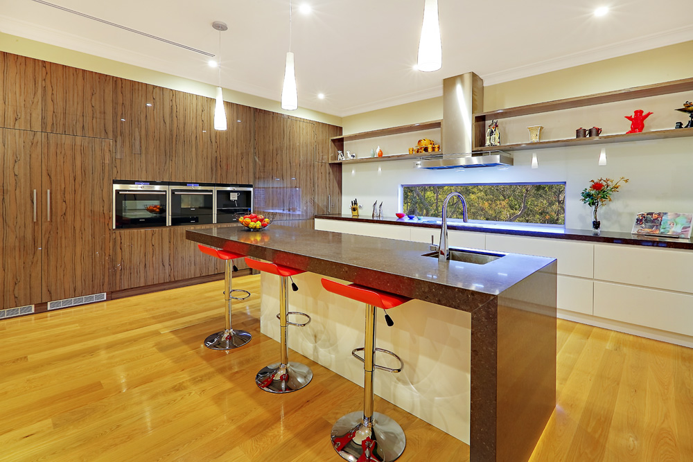Impala’s client was building a new home in a rural area of Sydney. The client commissioned Impala to design joinery throughout the house, including the kitchen, laundry, vanities, BBQ area and wardrobes. Thesurroundings were a big influence on the colour scheme and materials used throughout the home, with the home owners favouring taupes and darker timber veneers with organic stone colours.