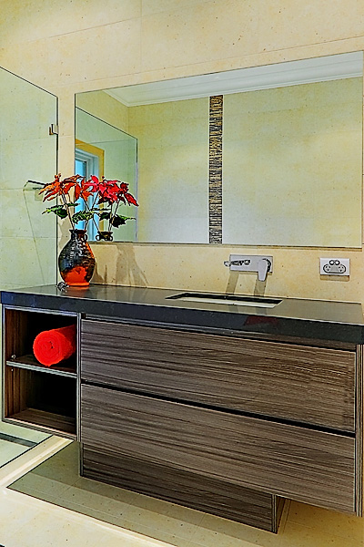 The joinery designs are fuss-free and infused by nature, through the lavish use of textured materials and organic stone.