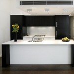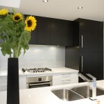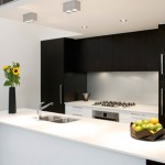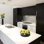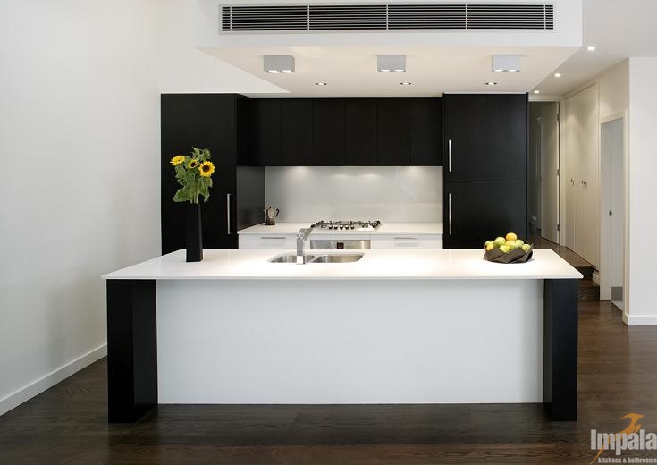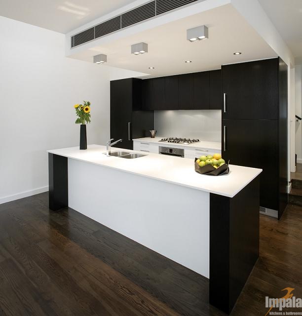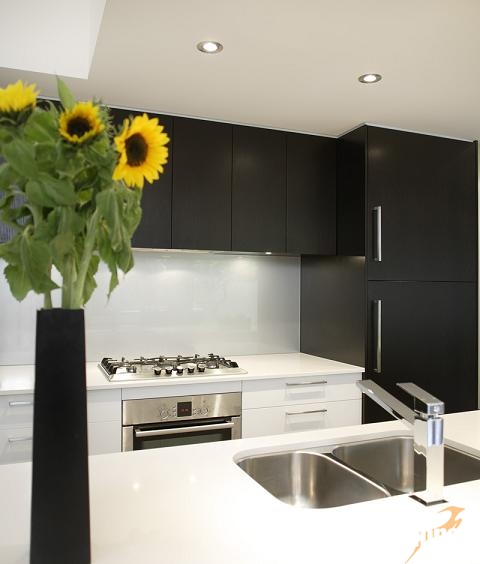The client chose white satin polyurethane doors and wenge timber veneer with a pure white stone top. The glass splashback is a fine silver metallic. The colours work with the modern renovation, bringing a contemporary, crisp feel to the previous older style cottage.