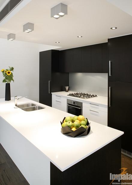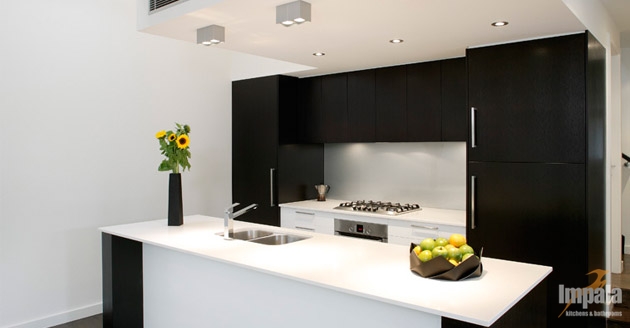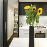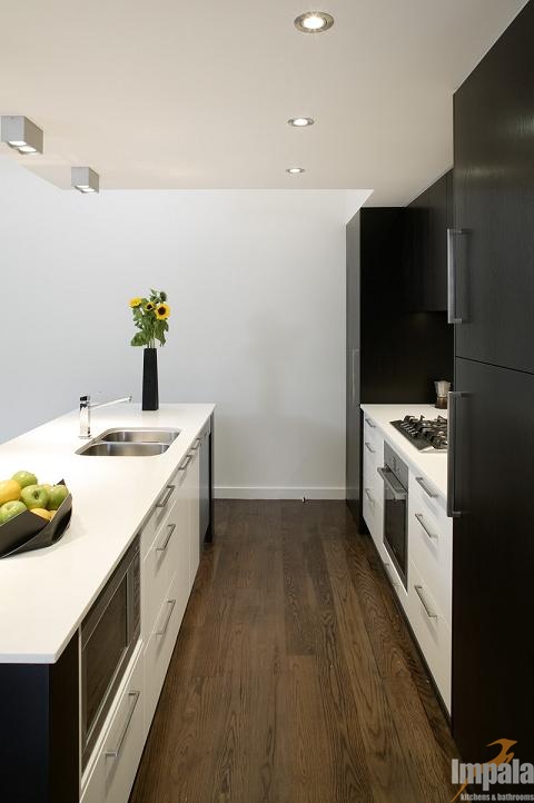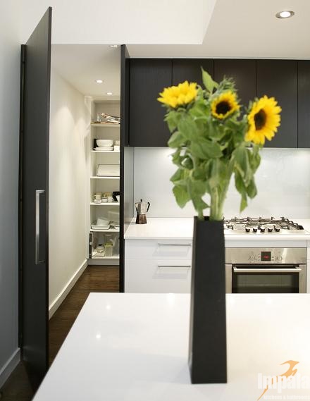Impala designed a kitchen, concealing a large walk-in pantry behind the cooktop cabinets.To the right side is a tall cabinet concealing the fridge and freezer and to the left is a tall door behind which is access to the walk in pantry. A door-activated lighting facilitates vision with ample shelving for pantry staples and small appliances.