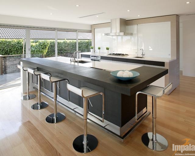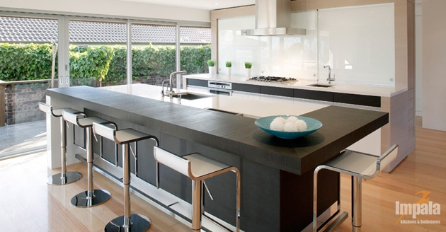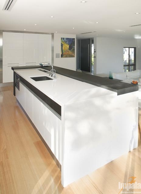 Impala’s client was building a new home on Sydney’s Northern Beaches. The client wanted to use interesting materials, provide seating for his family and plenty of storage. Key to the design was a large island unit and a wall behind the island for storage constructed from joinery.