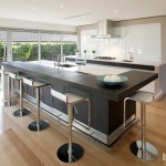 The striking island unit enables practical seating and the lower bench top allows for food preparation. The lower bench top has recessed cavities for bottle storage for oils, salad dressings and so forth. A microwave is positioned underneath for re-heating meals or snacks. One of the two sinks in the kitchen is also in the island assisting in food preparation. Dark timber veneer around the bar back and on the raised servery area matches that of the top drawer fronts in the other kitchen joinery. A custom stainless steel tread around the island perimeter and foot rail adds to the opulence of the kitchen design.