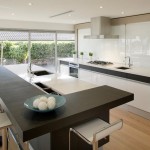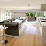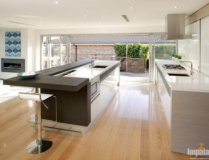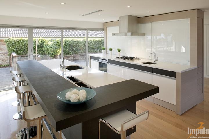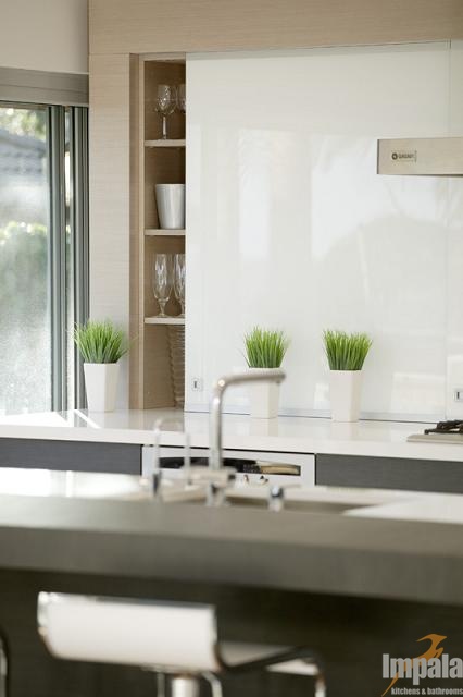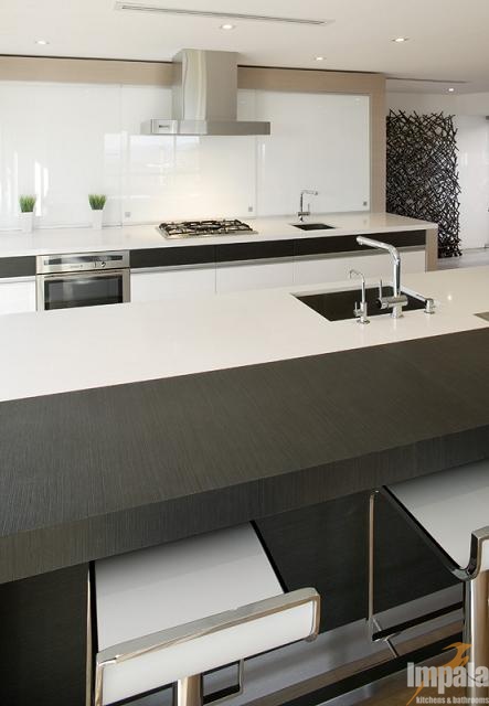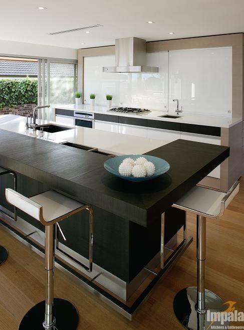 The tall unit behind the island has sliding glass doors, where items such as glasses can be stored. A lighter coloured timber veneer was used as a surround to complement the darker timber on the island and to match the walls behind. The tall storage area can also be accessed from the side and behind. Further large pantries were built into the wall adjacent to the island unit in white polyurethane with a stainless steel surround.