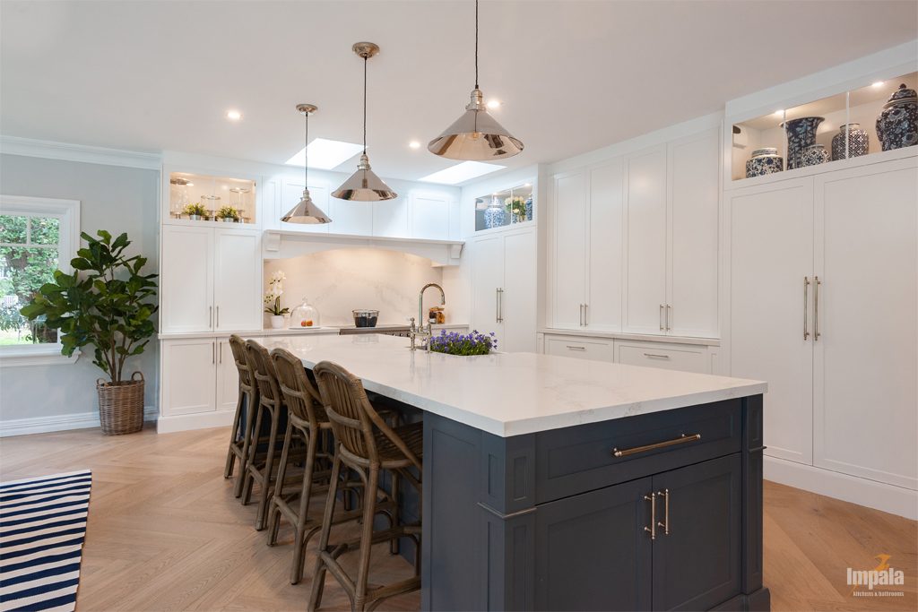 Storage and functionality were key design motivators for this family known to dabble in entertaining. An indigo island bench takes centre stage and adds drama to the otherwise classic kitchen. Bespoke joinery, including corner panelling on the island bench and a custom-designed traditional-style rangehood, commands attention and transforms practical elements into architectural pieces of art.