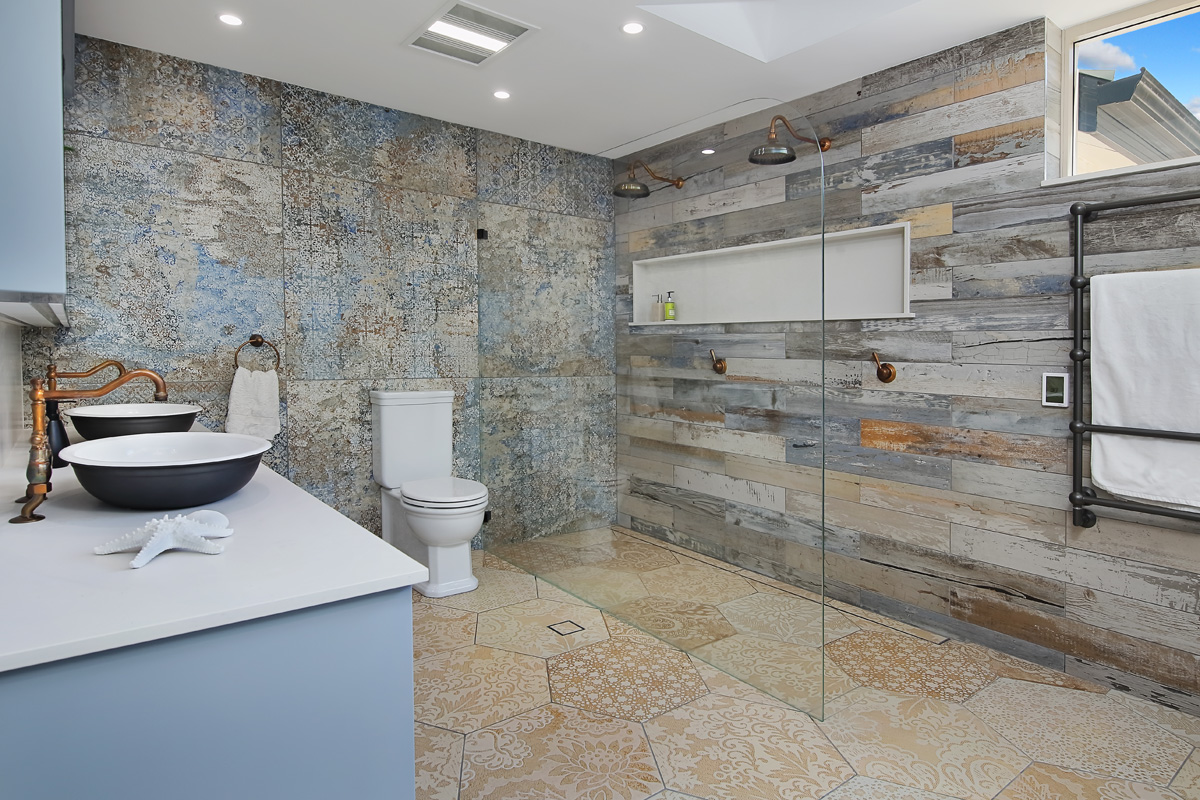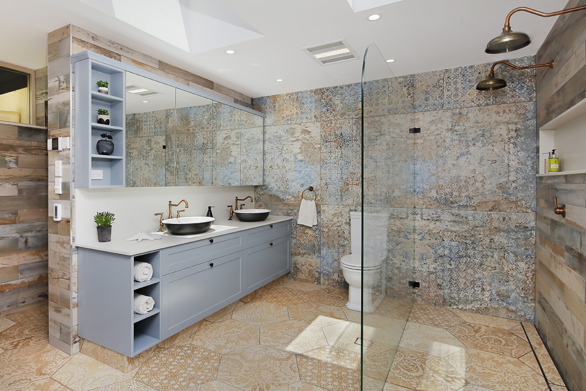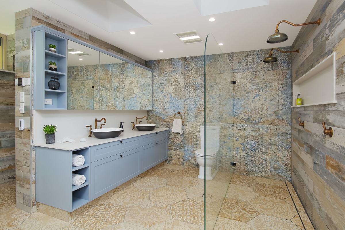 Bold, large, format tiles were used on the walls, with hexagonal patterned tiles on the floor. A feature of multi coloured timber-effect tiles were used as a textured feature on the shower wall. The client wanted a colourful and non-generic bathroom and the large, patterned tiles chosen created a dramatic look; delighting the clients.