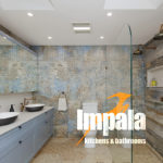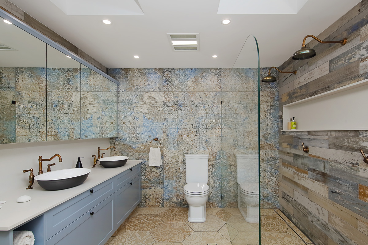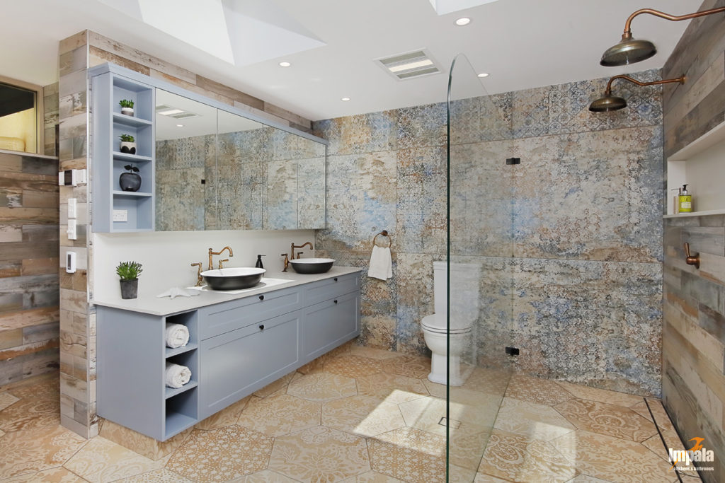 The client’s house is a mid 1980s, single level contemporary home, which has been extensively renovated over the last five years. The large ensuite is the final room in the house to be renovated. The existing bathroom overlooked a walled courtyard with a curved wall up to a height of 18000mm. The client request was to enclose the garden courtyard into the new bathroom in order to to double the size of the ensuite. The rest of the house has been renovated, in a modern style, with a traditional twist. The client desired the ensuite to compliment the newly renovated style of the house and requested lots of colour and an injection of life into the feel of the bathroom.
