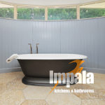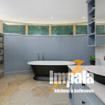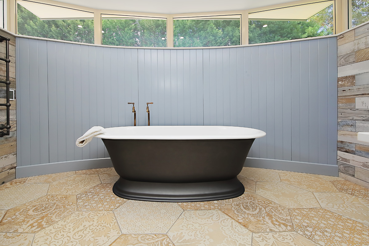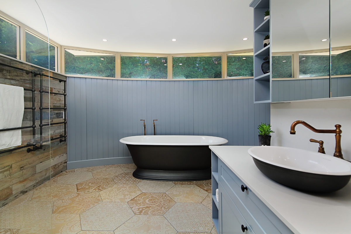 As a final touch to bring the colours and textures together, the curved wall surrounding the bath is V joint timber panelling, painted in the same Dialogue blue/grey as the vanity. The clients particularly love the V joint panelling detail over other alternatives for a curved wall.