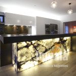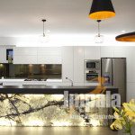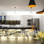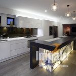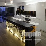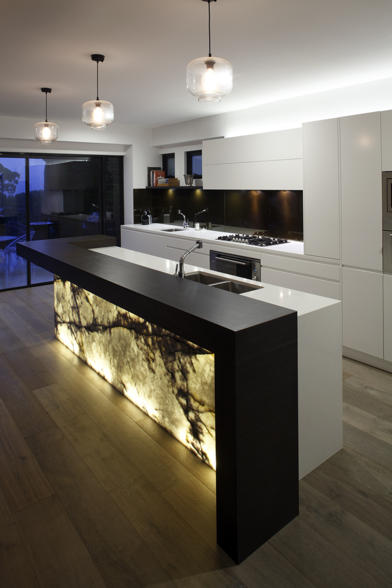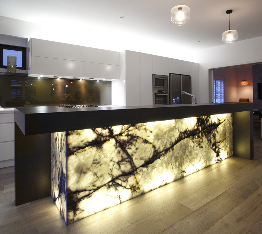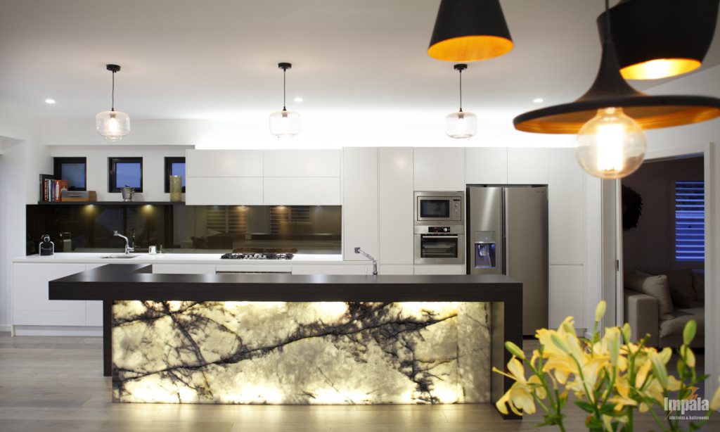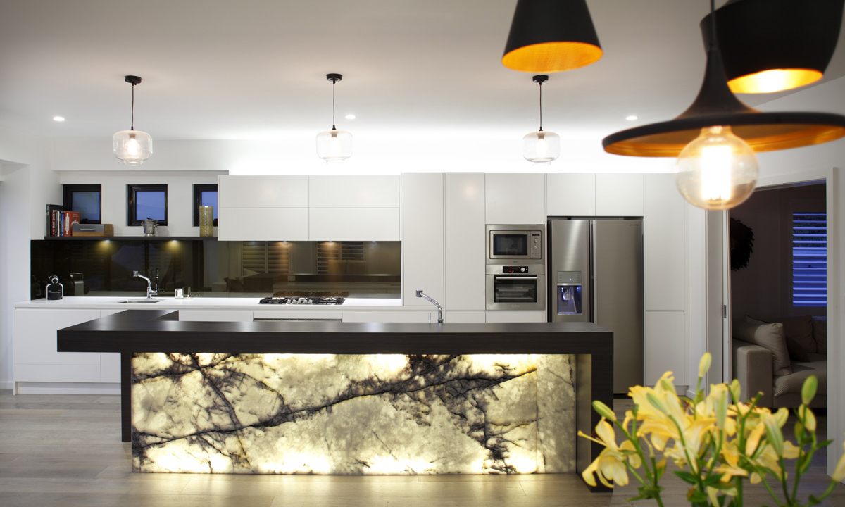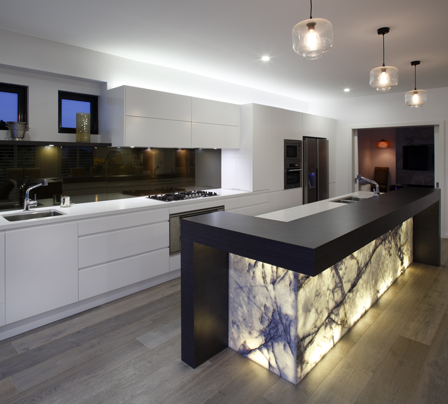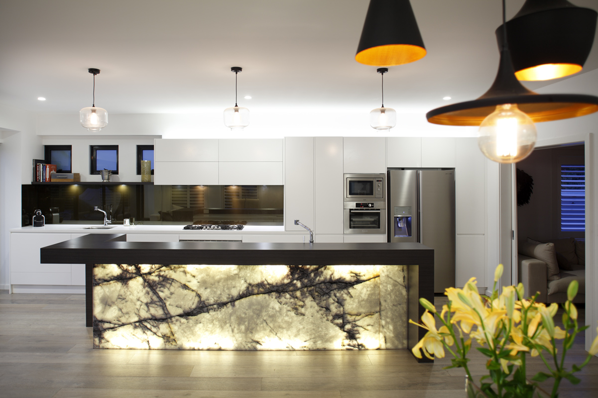 The kitchen was to be contemporary and have that “wow” factor. Central to the design was the island unit. It was to serve as a working space and double as a servery. The size, design and layout of the island was critical in getting the kitchen flow just right. Once this was nailed, the next step was considering the colours and finishes to be incorporated. A neutral back drop of satin white cabinets housing the majority of the kitchen’s appliances was used. The island was to be the standout, using back-lit New York marble and dark timber veneer for the raised servery. Seating is to the left of the island unit, so that the featured stone is not obscured by stools. Finishing touches such as the pendant lights and dark moody splashback add a contemporary, sophisticated style.