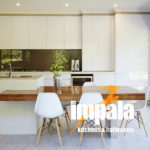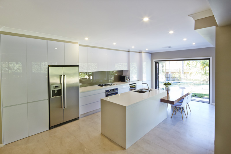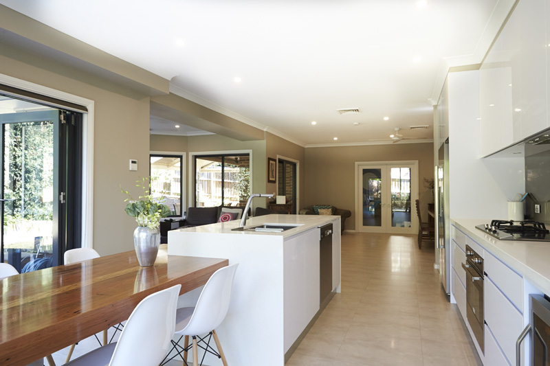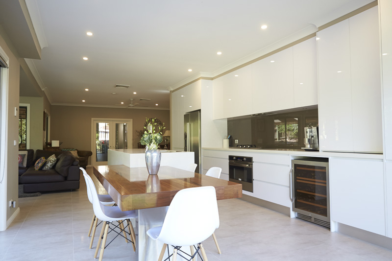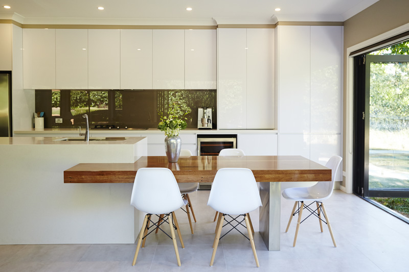 The crisp white kitchen cabinets and stone bench tops stand out from the taupe-painted walls and the glass spalshback complements this treatment. The timber table adds texture and an important design feature to the space.