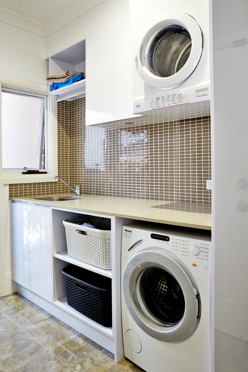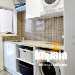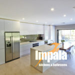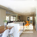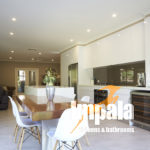 Impala designed the kitchen to have a drop-down timber table to allow for casual eating and used neutral hues for the kitchen cabinets and glass splashback. Ample storage was provided with a large pantry and concealed appliance area. A wine fridge was built in and plenty of bench space for food preparation.
