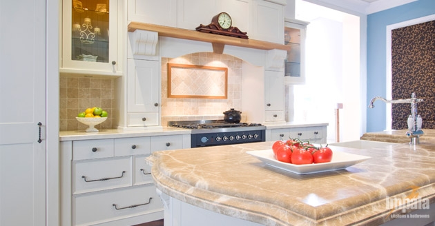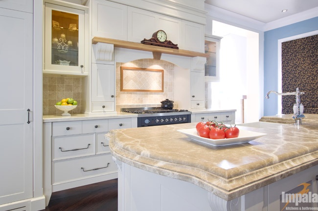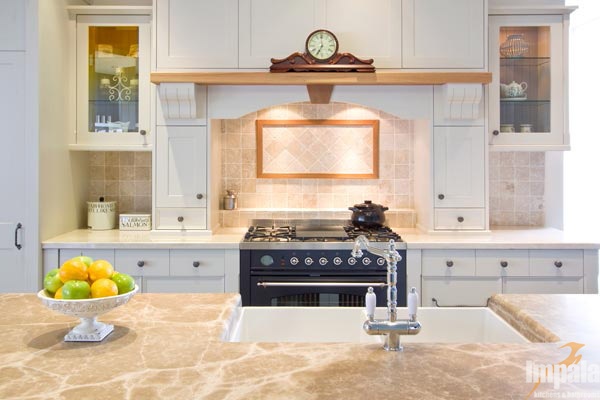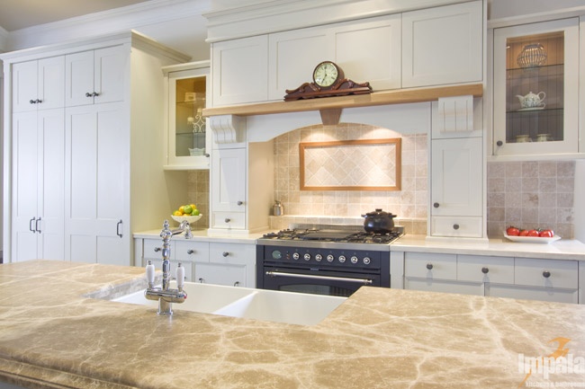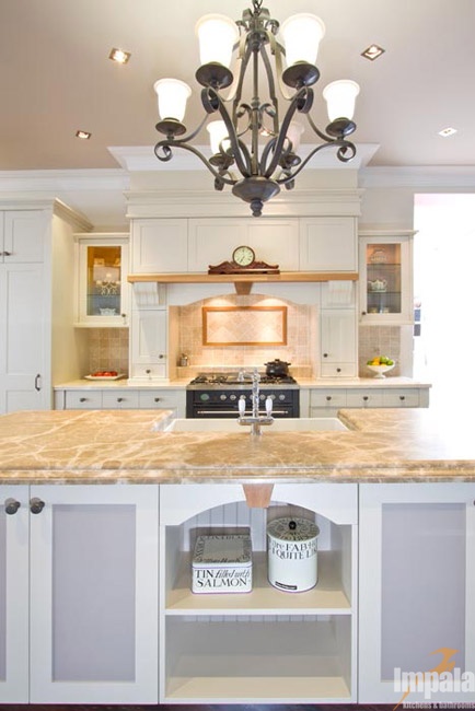This provincial kitchen is on display in our Brookvale showroom. The kitchen was designed to showcase Impala’s workmanship and provide inspiration for those seeking hand painted cabinets. The kitchen features two-tone hand painted doors with a custom profile. The kitchen design has timber highlights over the mantle and on the island cabinets with one mirroring the other to balance the design. A butlers’ sink and upright stove were incorporated as was an integrated fridge to demonstrate treatment for typical appliance inclusions in such a style of kitchen. A combination of bench top materials were used, both marble. If you are looking for a provincial style kitchen, we invite you to visit our Brookvale showroom.