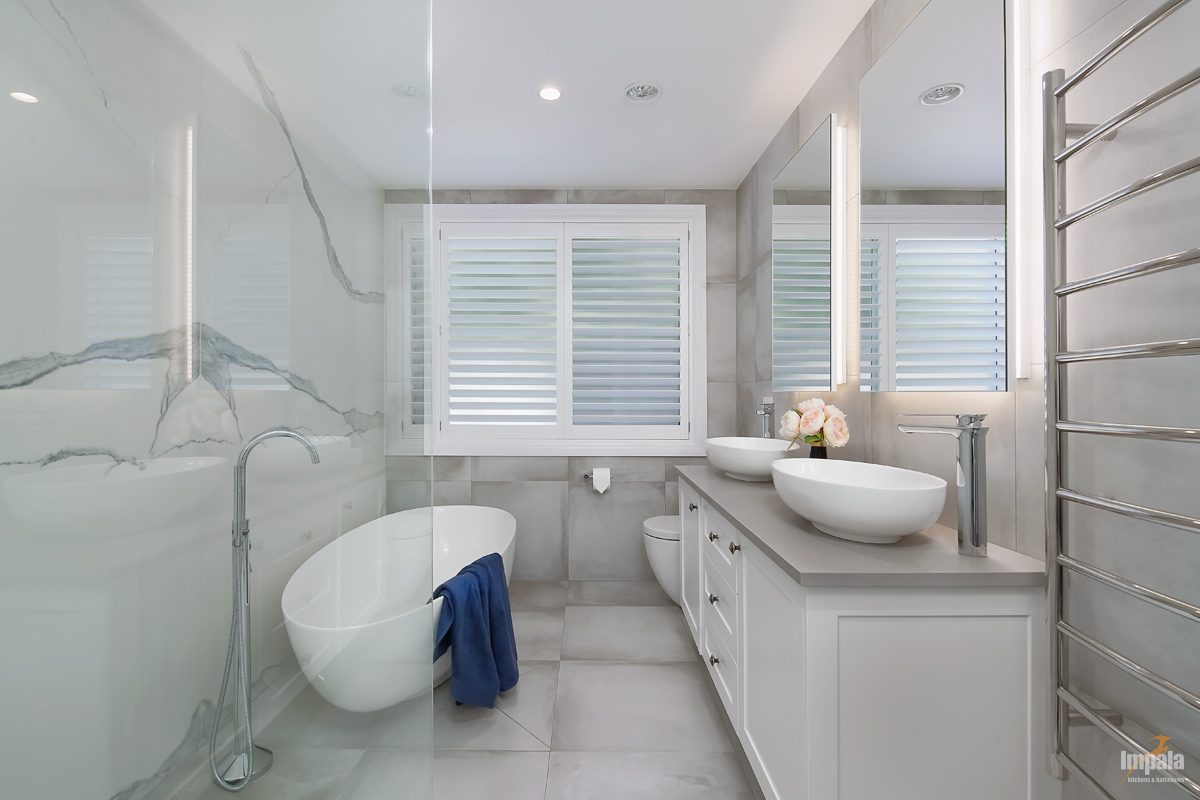 With clever re-design Impala Designer Paul Johns created a bathroom exude dramatic luxury. Custom built double vanity fits the bill for this busy family. The tear shape bath gives that touch of luxury. The large walk in shower there is now plenty of room for growing teenagers.